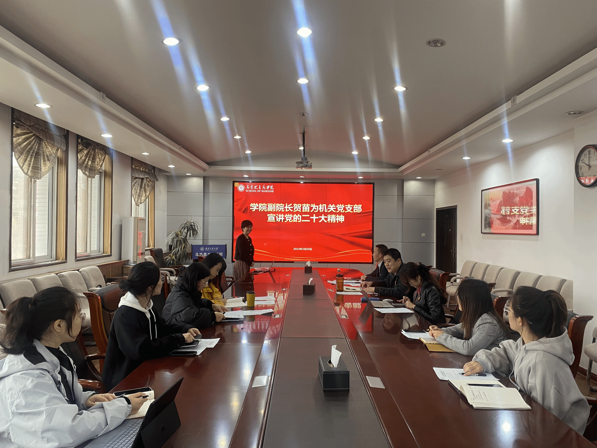 贺苗以《深入学习领会党的二十大精神》为题,从深入学习领会党的二十大的重大意义、深入学习领会党的二十大的主题、深入学习领会过去五年的工作和新时代十年伟大变革、深入学习领会习近平新时代中国特色社会主义思想的世界观和方法论、深入学习领会中国式现代化、深入学习领会党的二十大对未来五年党和国家各项事业发展的战略部署、深入学习领会以党的伟大自我革命引领伟大社会革命的重要要求、深入学习领会发扬斗争精神、增强斗争本领、坚持团结奋斗的时代要求八个方面,结合MissAV