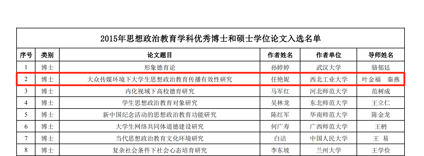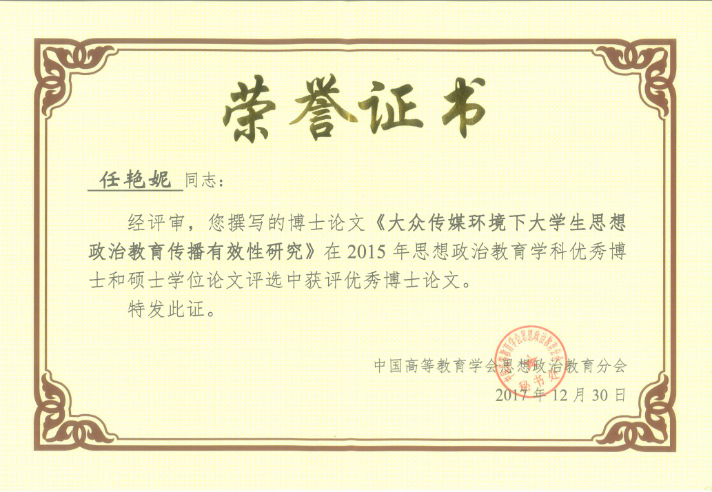 思想政治教育专业博士生任艳妮撰写的博士论文《大众传媒环境下大学生思想政治教育传播有效性研究》成功入选。本次评选工作是为深入贯彻党的十九大精神和全国高校思想政治工作会议精神,推动思想政治教育理论创新和学科建设,提升思想政治教育学科研究生的培养质量和创新能力。在教育部思想政治工作司的指导下,经过部直属高校及各地思想政治教育研究分会遴选推荐、中国高等教育学会思想政治教育分会组织专家匿名评审,历时一年半的时间,最终从符合参评要求的31篇论文中评选出8篇优秀博士论文。
