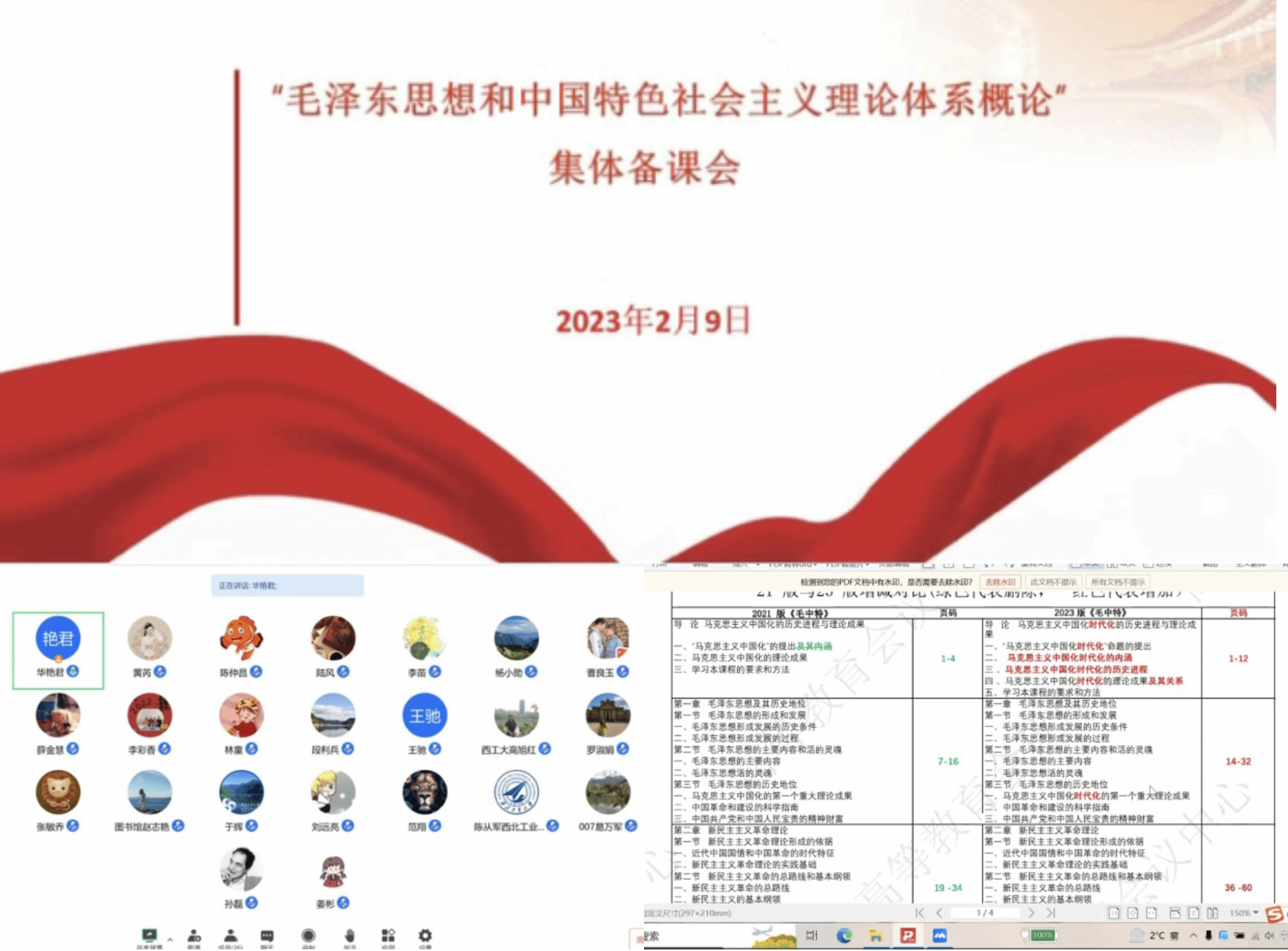 《毛泽东思想和中国特色社会主义理论体系概论》教学团队组织召开线上集体备课会。备课会围绕《毛泽东思想和中国特色社会主义理论体系概论》新教材改版和新学期专题教学设计进行交流研讨。会议由教学主任华艳君副教授主持,马克思主义中国化研究系主任高旭红教授、支部书记陈诚平副教授和课程组专兼职教师共28人参加会议。高旭红教授全面梳理了新旧教材修订的主要内容,并就各专题教学设计重点提出了建议。与会教师依次就本课程专题教学的设计思路、教学重点及教学手段创新进行了热烈的交流探讨。大家纷纷表示加深了对新版教材修订思路的认识和理解,一致认为要在授课中贯彻落实习近平新时代中国特色社会主义思想和党的二十大精神,全面推动党的理论和实践创新成果全面融入课程教学、进入学生头脑。