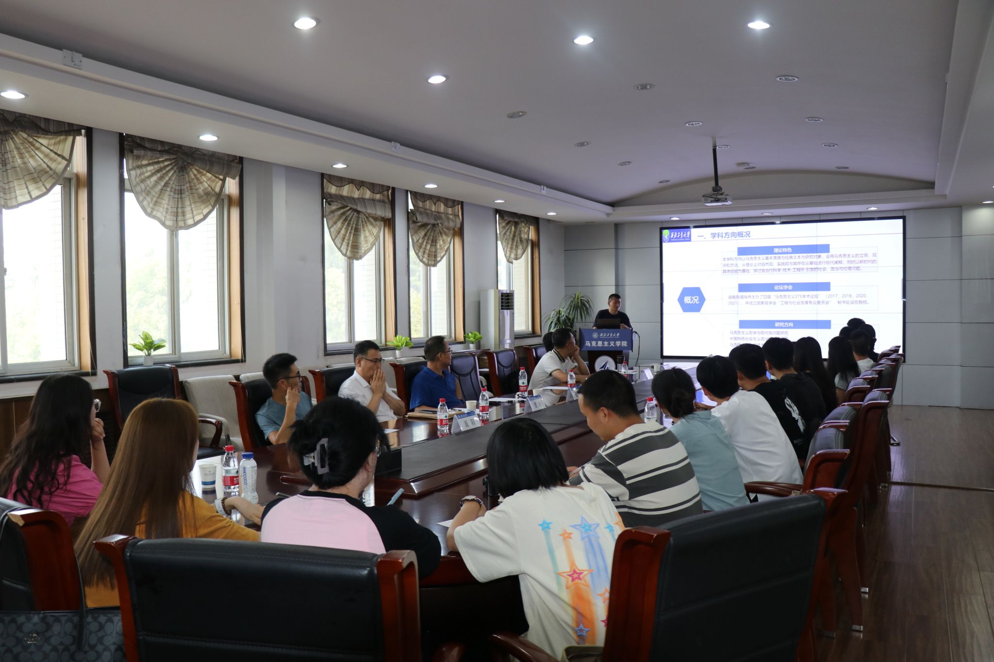 第一个环节,由系主任杨荣介绍马原系基本情况,主要从学科方向、论坛协会和科研成果三个方面详细介绍了本系老师的研究方向和取得的丰硕成果。