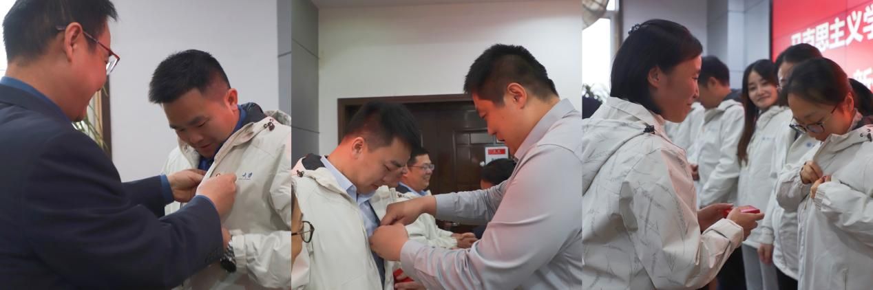 党委副书记李刚及导师代表张云龙、杨冰郁为同等学力博士新生佩戴院徽并合影留念。