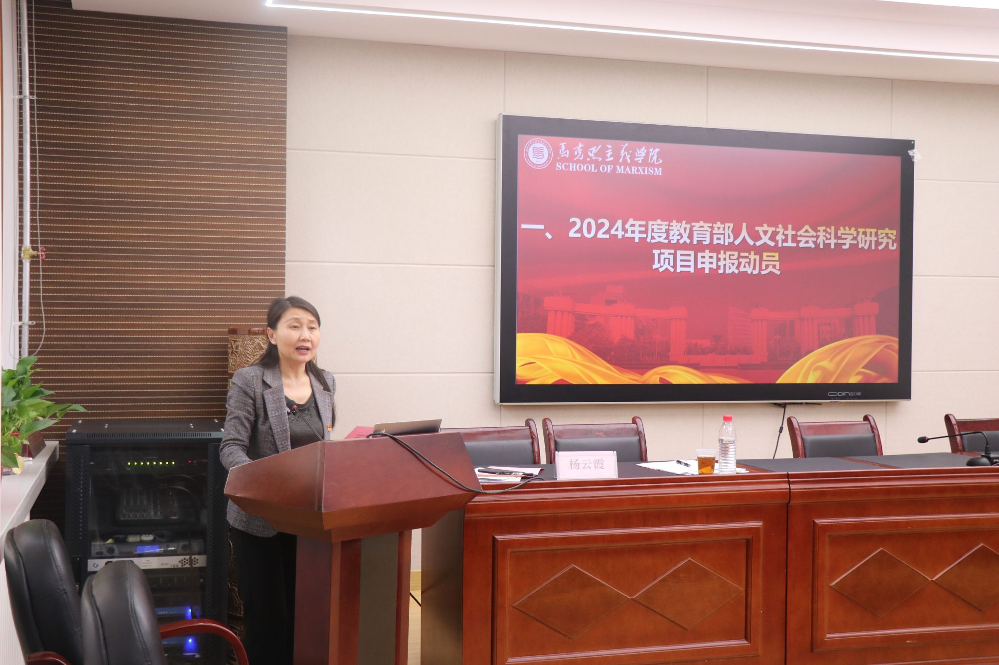 院长杨云霞对2024年度教育部人文社会科学研究项目申报做详细解读并动员,她介绍了申报流程和要求。她表示,教师在教学过程中要注重教学与科研的双向链接,围绕MissAV