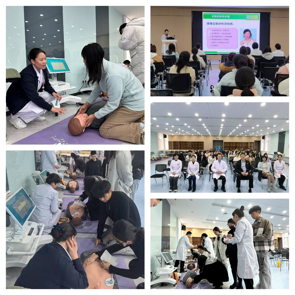 医院基本情况,并结合自身临床经验分享了秋冬季保养皮肤的方法。随后,校医院副院长何凯亮老师为大家带来了精彩的急救理论知识讲解。本次急救的理论培训主要包括心肺复苏术、海姆立克法解救气道异物、AED的使用等三个专题。何老师通过对比心搏骤停患者抢救案例及国内外抢救成功率,深刻指出了我国目前推广“全民急救”的紧迫性。何老师以生动语言、通俗易懂的培训形式对人体心脏供血原理、心肺复苏前注意事项、如何指挥周围人员协助拨打120、取用附近AED机、心肺复苏基本操作流程、AED设备使用步骤和注意事项等内容进行专业性讲解,并利用人体模型进行现场演示。