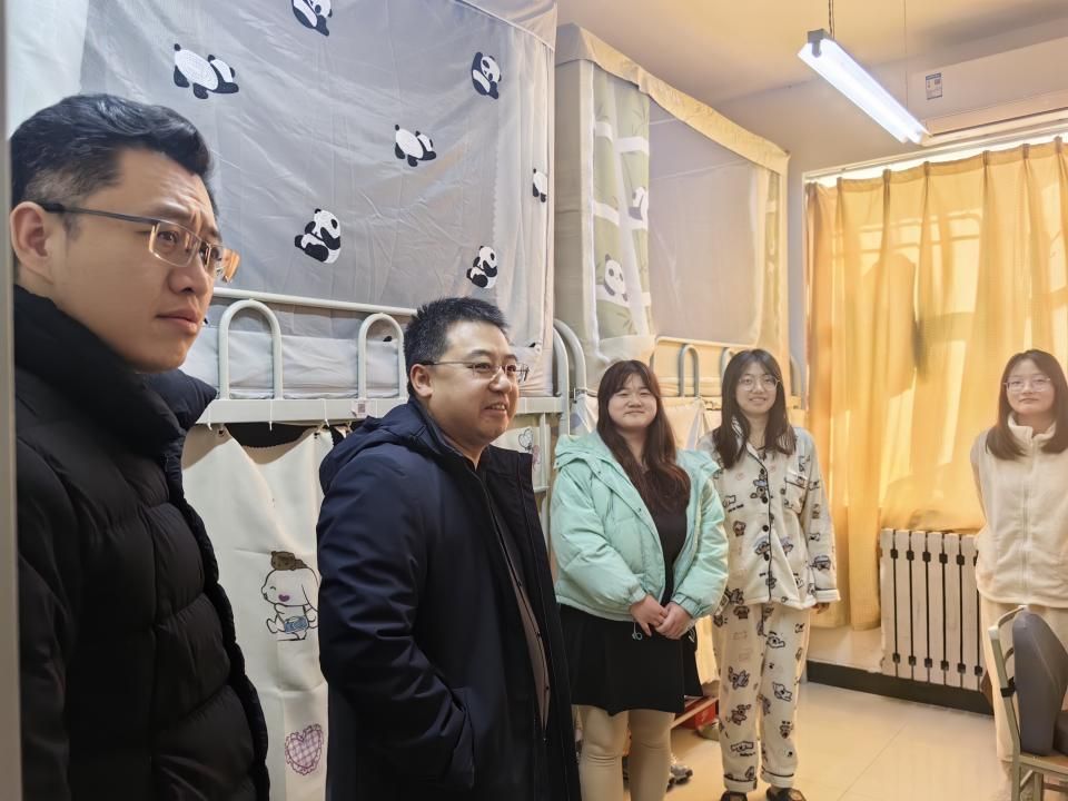 党委书记王彦革、党委副书记耿云辉与学工主管、辅导员、学工干部深入学生宿舍,开展新年慰问,深入了解学生的思想、学习和生活情况。走访期间,院领导与同学们亲切交谈,听取学生对宿舍环境、学习成长等方面的意见和建议,提醒同学们合理规划作息时间,并重点排查宿舍安全隐患和开展安全教育。