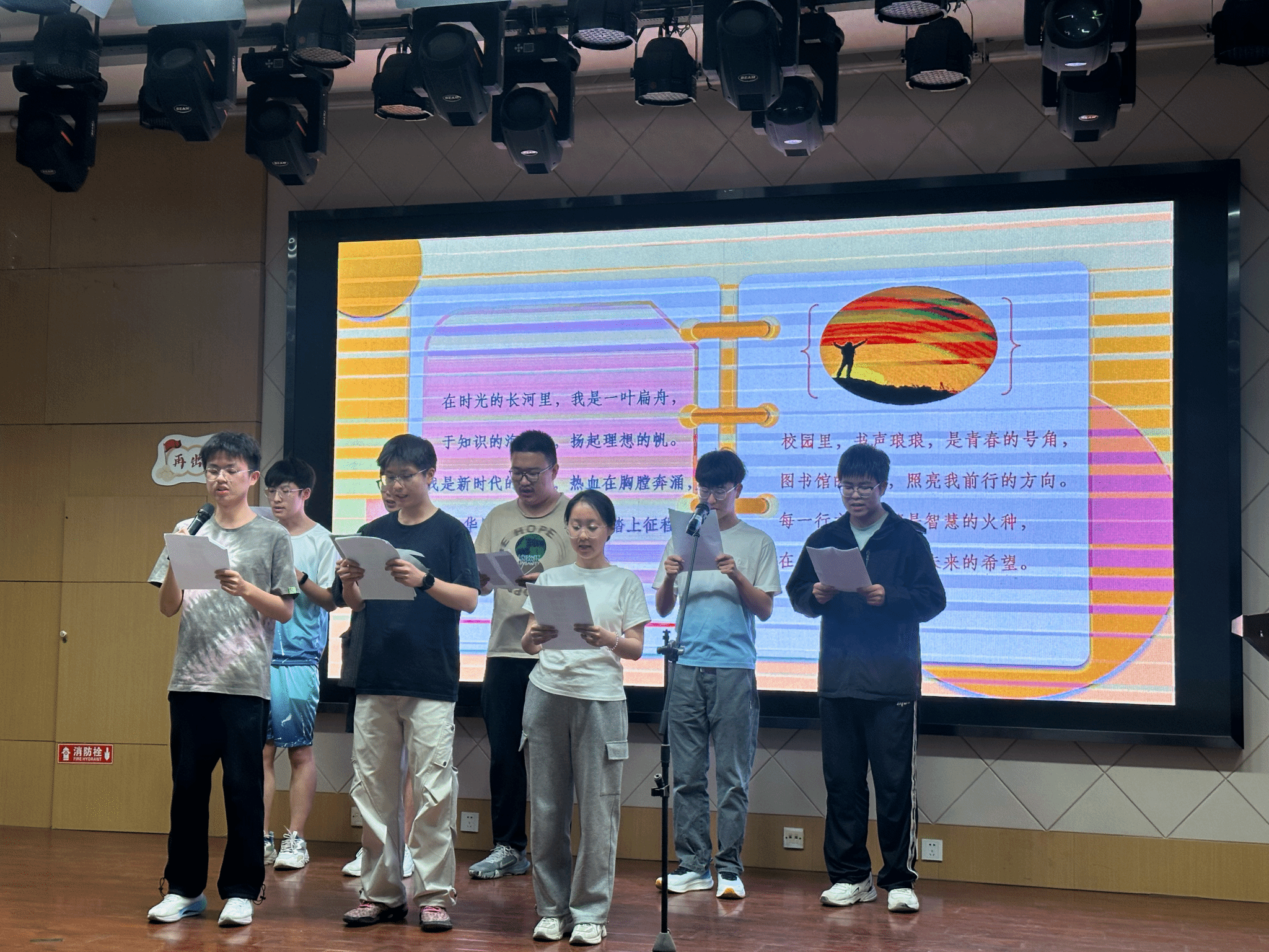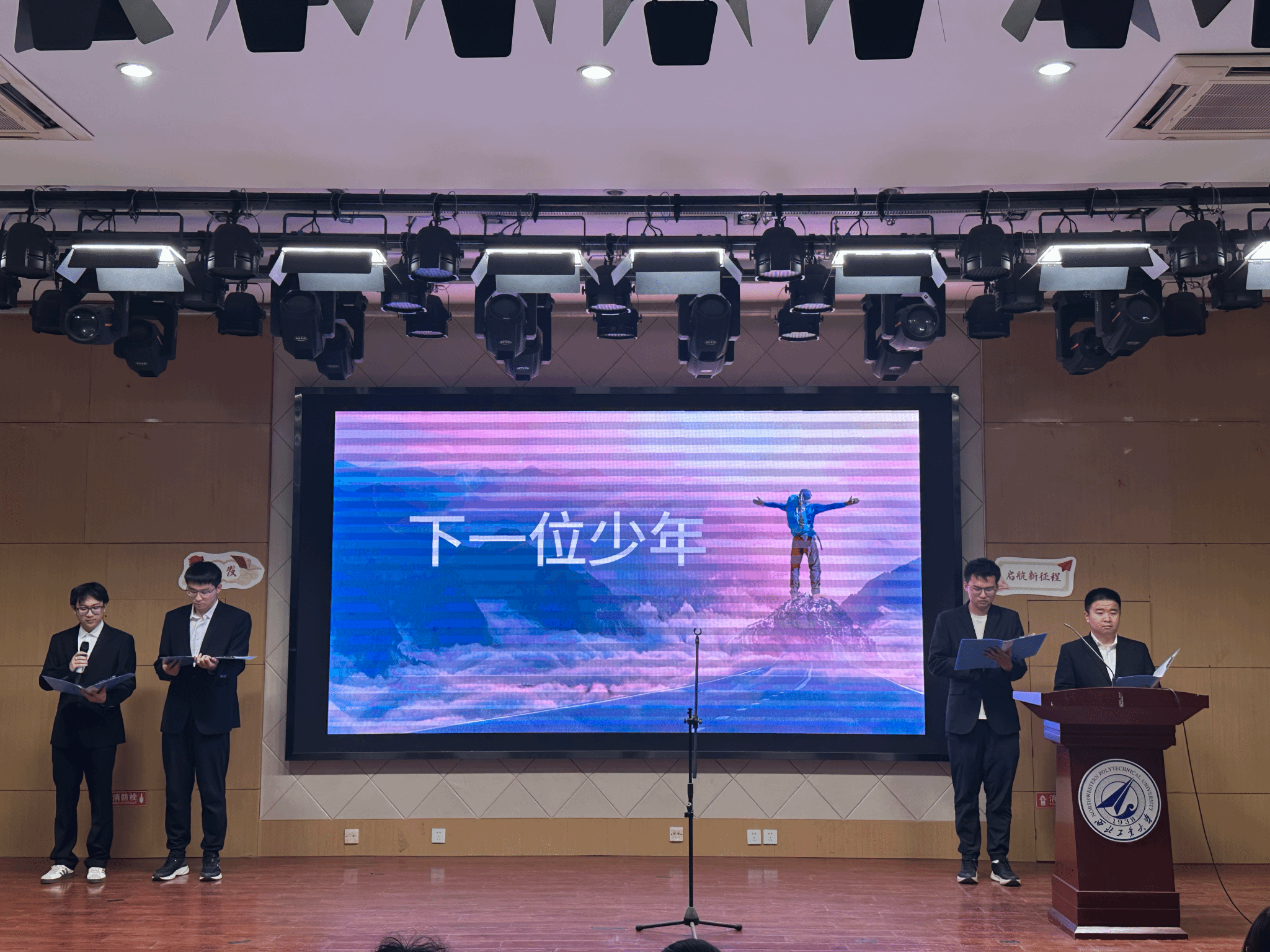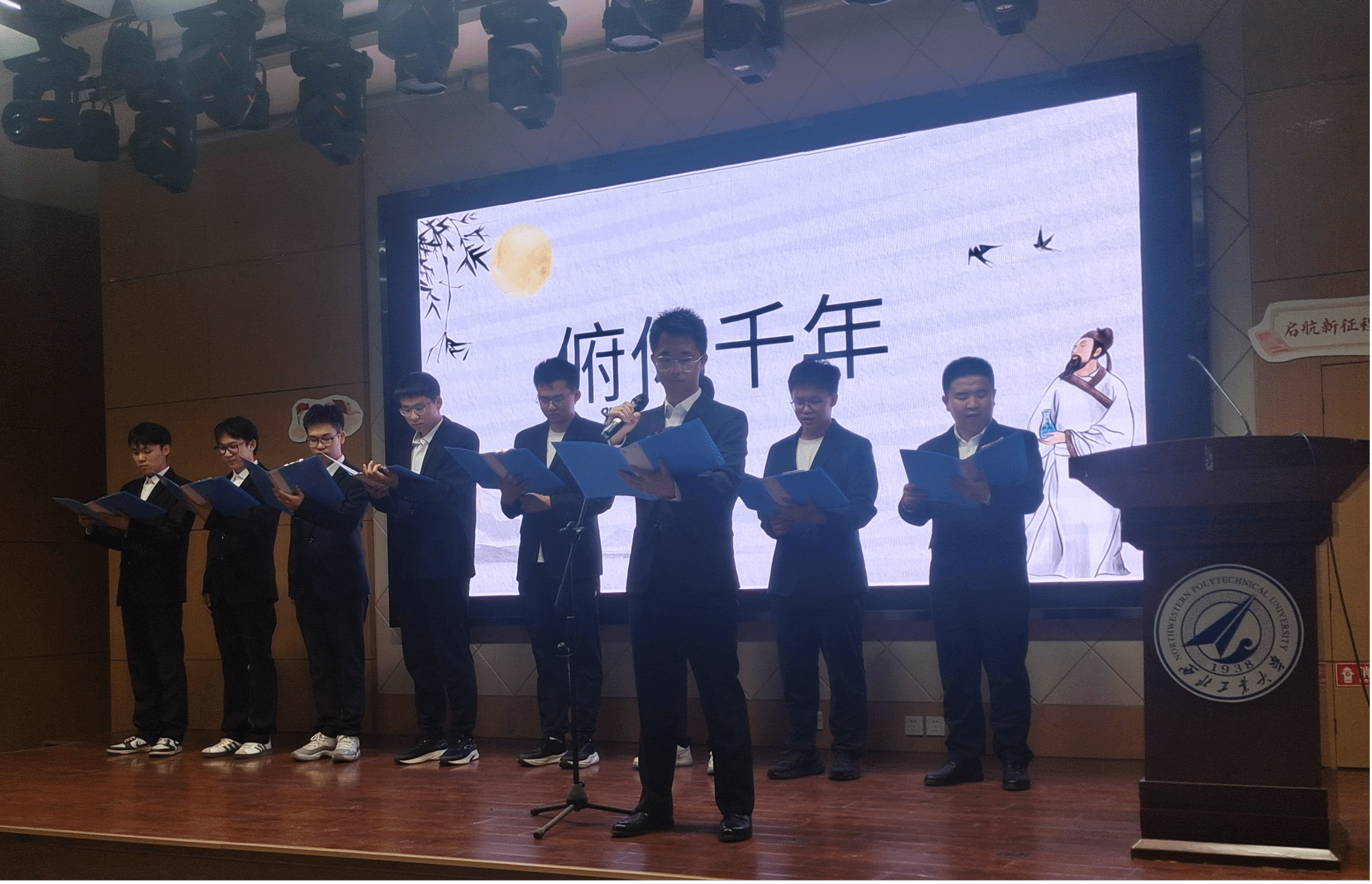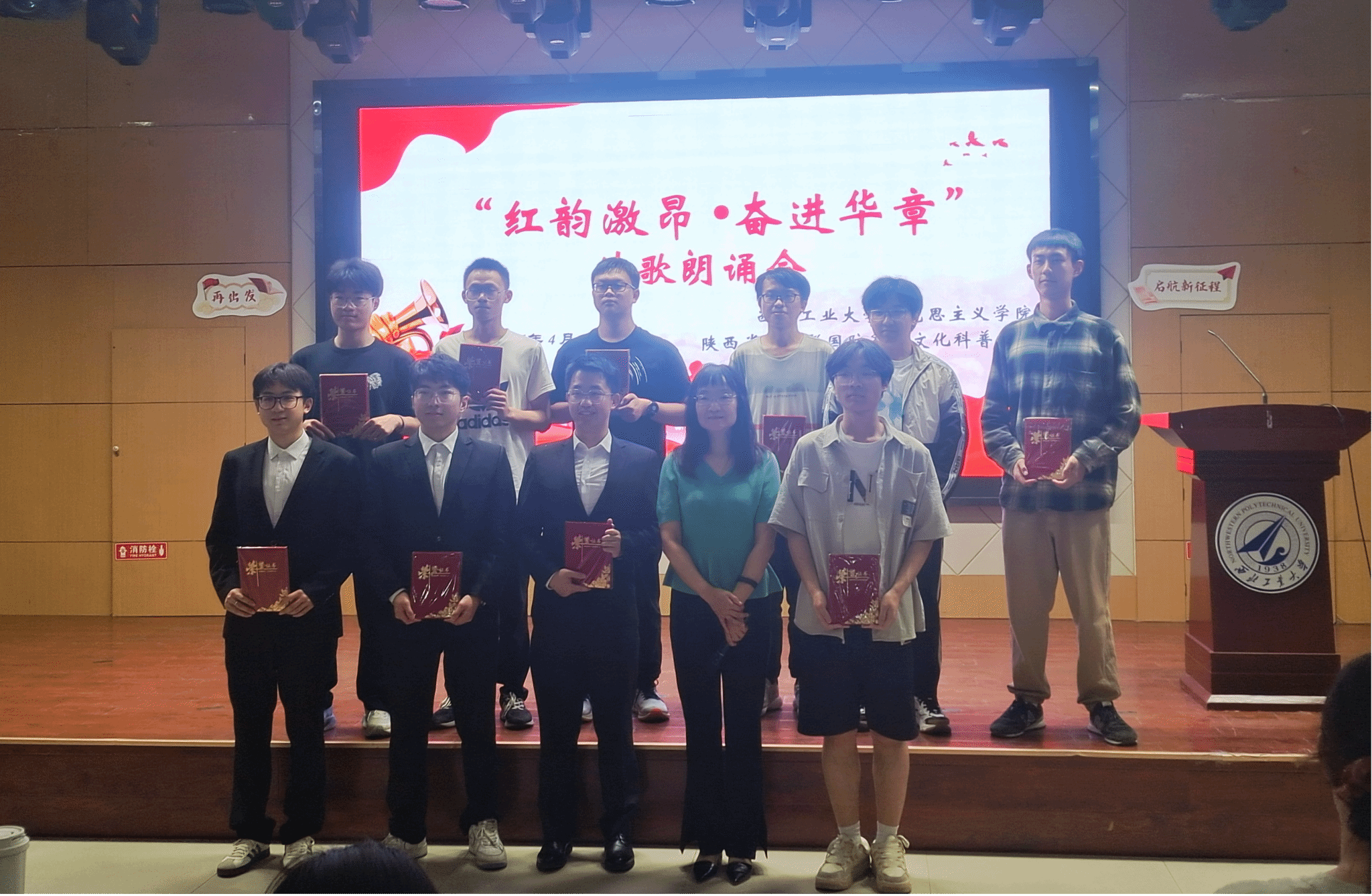 207报告厅,参加诗歌朗诵会的同学经过抽签,筛选出来自全校的十个朗诵小组,现场朗诵并表演他们自创的诗歌作品,其余同学提交朗诵视频参赛。这些作品有的抒写家乡建设的成就、生态文明的奇迹,有的讴歌共和国筚路蓝缕的历程、祖国日新月异的巨变,有的表达对科技前辈的尊敬与仰望、科技喜报频传的自豪,有的遥想古路坝灯火、表达今日工大学子进取奋发的豪情,有的抒发青春理想、礼赞科技报国……现场诗声琅琅、同学们激情澎湃,展现出西工大学子奋进向上的昂扬风貌。