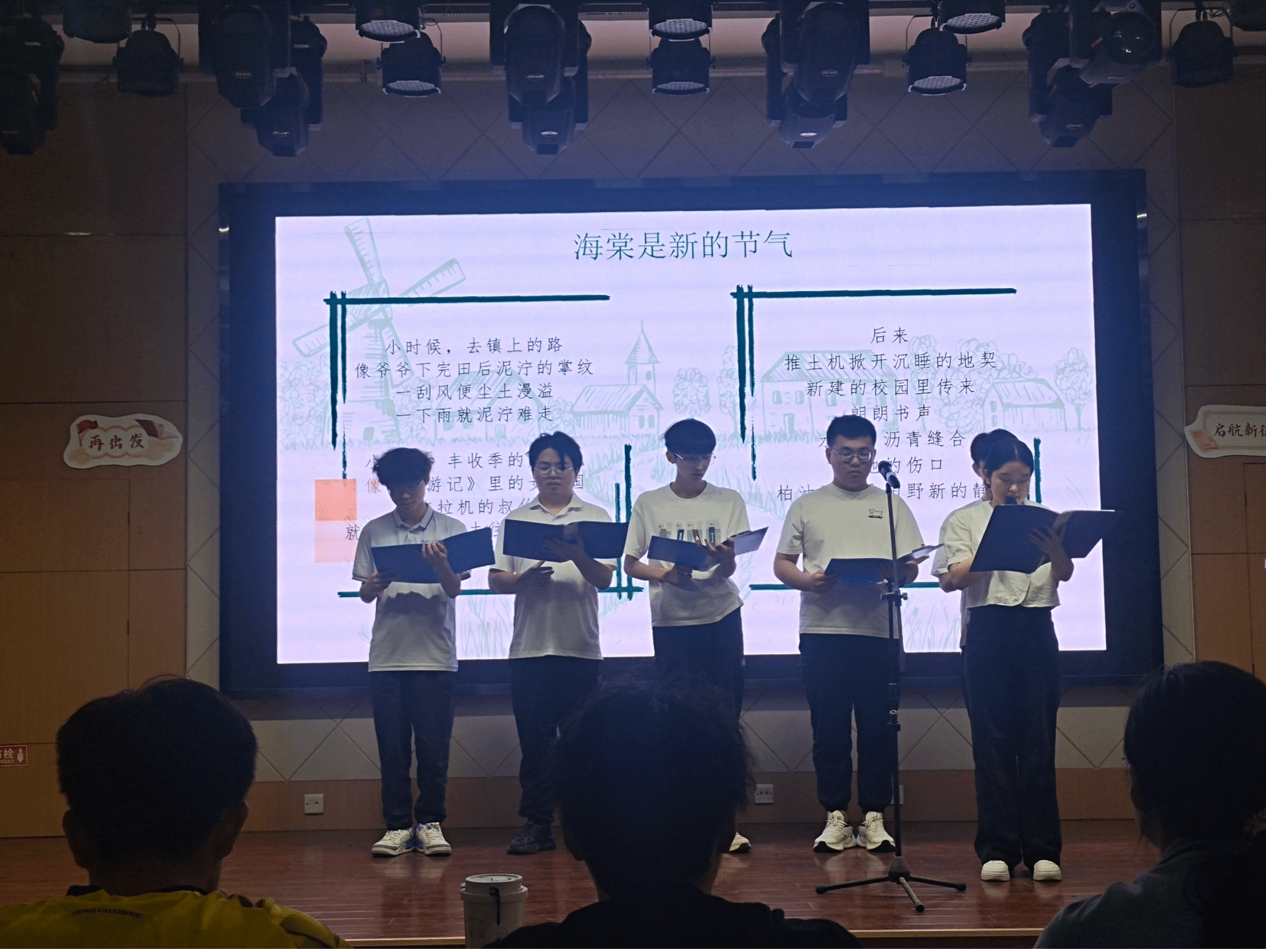 本次评审机制突破常规:除专业教师评审外,特别从35支参赛团队中随机抽取10名学生组成大众评审团,实现评审视角的多元互补,彰显赛事公正性与学生主体性。最终,第12组以整齐的着装、恰当的视频背景烘托、传神地表演,赢得了台下最热烈的掌声,摘得桂冠;13组以流畅的背景画面与音乐,配合声情并茂的朗诵、沉郁顿挫的吟诵斩获二等奖;16组凭借深情演绎了中华民族的百年历程与浴火新生的历程,放声歌唱了新时代青年学子投身科技的壮志,以对诗歌内容的深刻理解与表达获得三等奖。