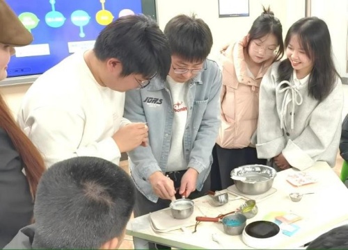庹渝洲以“香凝三航梦,蜡映国家月”为主题分享蜡在历史上的广泛应用,细致讲解蜡烛制作的化学原理与制蜡工艺流程,并指导同学们开展香薰蜡烛创意作品制作。创意作品制作环节展现了化工专业的学科特色,将专业知识转化为生动有趣的实践体验,搭建起理论与实践沟通的桥梁,让学生在动手实践中感受知识应用的魅力。