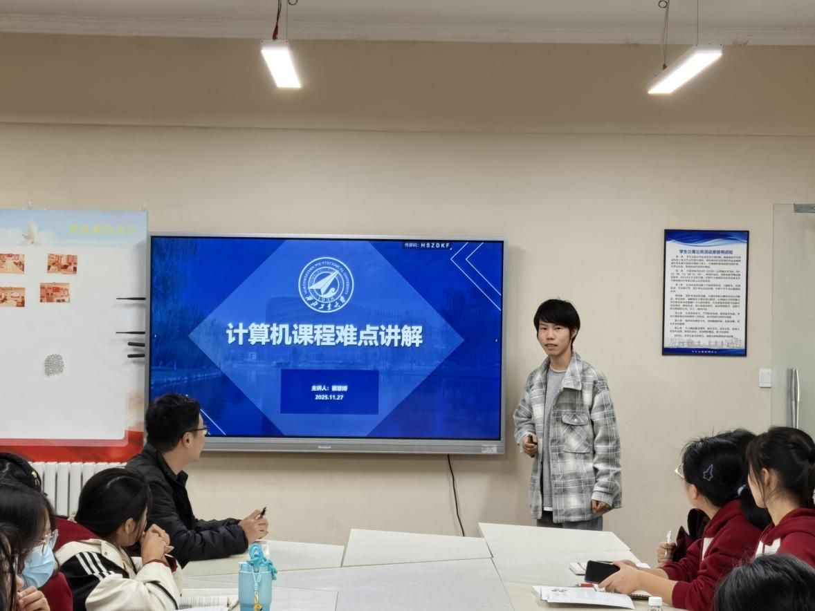 辅导过程中,蔡思博首先用比喻生动解释了图灵机原理;随后讲解了数制间的转换,缓存、内存、外存的多级存储体系和多种智能算法机制等多个核心知识点。在答疑环节,同学们围绕递归实现、存储层次优化等话题展开讨论,蔡思博以例题讲解帮助同学们巩固知识。