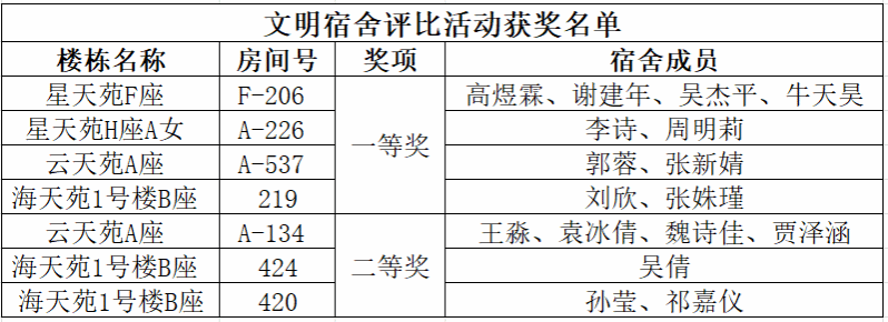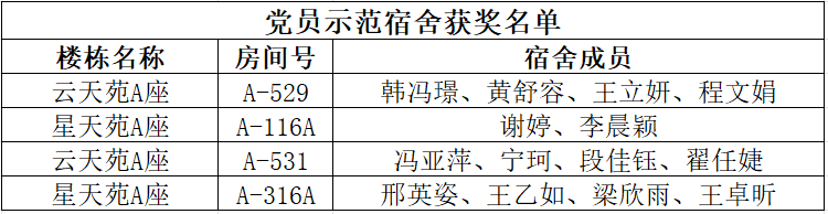 4间宿舍“党员示范宿舍”荣誉称号,7间宿舍“文明宿舍”荣誉称号。这些宿舍不仅环境整洁、氛围和谐,更在党员引领、学风建设、志愿服务等方面作出了表率。