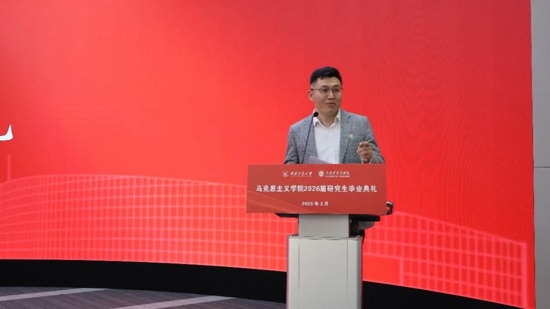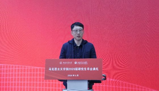 硕士优秀毕业生代表陈宗超、博士优秀毕业生代表石映昕依次发言。陈宗超对母校培育与师长教诲表达感恩,分享了自身理论学习与实践结合的成长感悟。石映昕围绕“三实一新、知行合一”分享科研心得,寄语同窗从容前行、不负韶华。