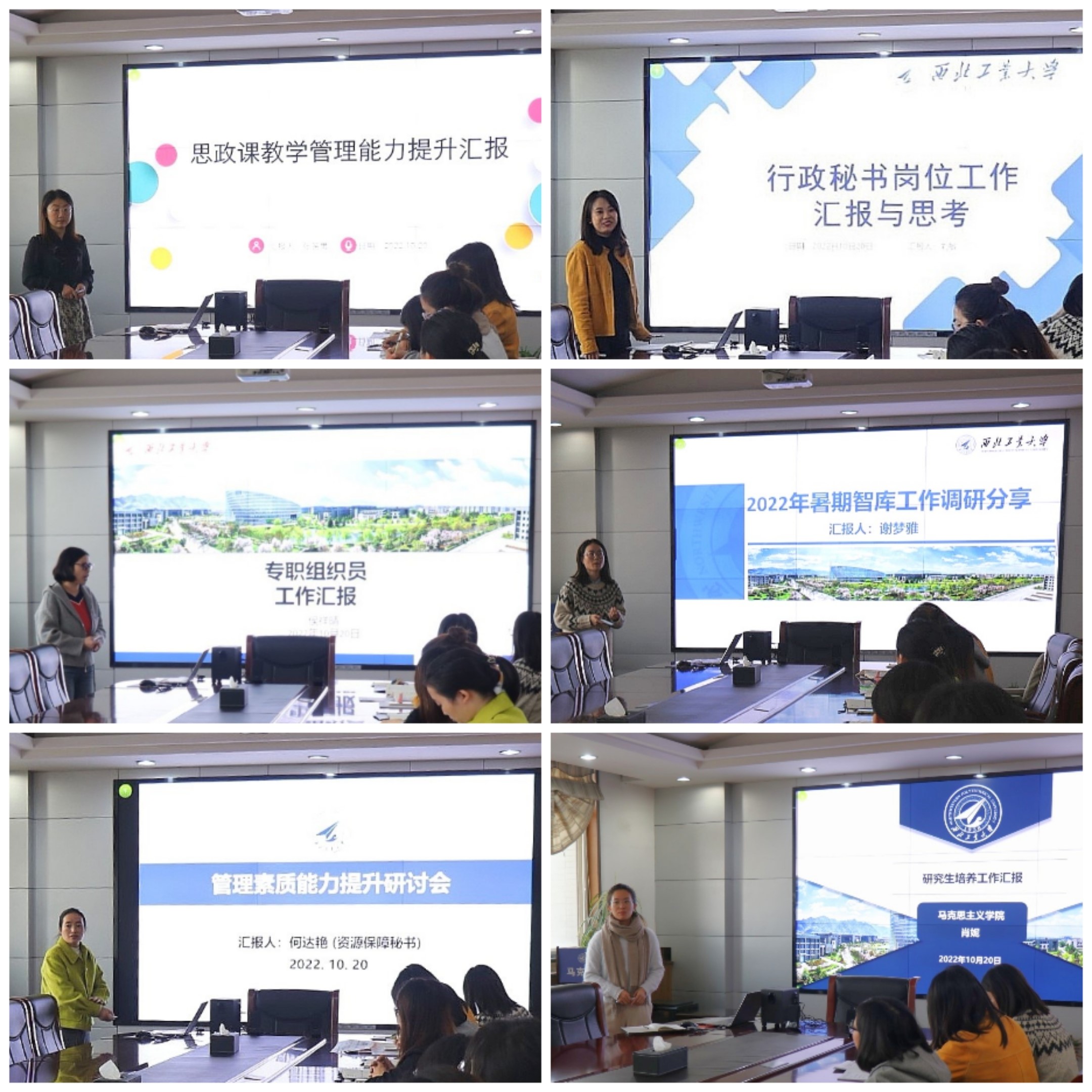 思政公共课开展情况进行了梳理并与调研高校进行了对比分析。行政秘书刘敏从行政秘书特点和定位出发,阐释了如何在工作中贯彻落实岗位育人。党务秘书(专职组织员)侯祥晴详细梳理了MissAV