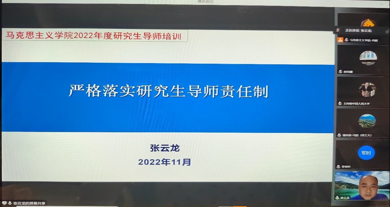 其次,李刚从学生工作、校园文化生活等方面,为与会教师做了工作情况介绍,提出导师在督促学生学业进度的同时,更多关注学生的身心健康发展;疫情当前,更加重视在校学生进出校园的审核管理工作,以学生的人身安全为第一,落实好“以学生为根、以育人为本”的教育理念。