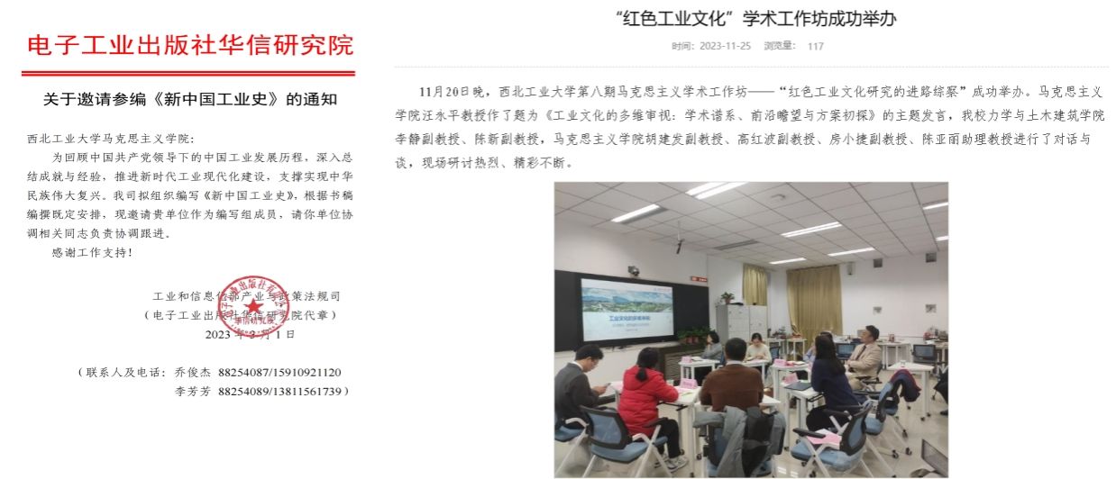3.积极深化“红色工业文化”研究。2023年初,汪永平成立“红色工业文化研究”团队,团队成员来自MissAV 、机电MissAV 和力学与土木MissAV 。团队成立后,受邀参与完成了工业和信息化部政策和法规司委托项目《新中国工业史》的编撰;获批了MissAV “双一流学科建设”项目“研究生高水平教材”系列之“中国工业精神谱系”课题;开展工业文化研究工作坊;指导研究生撰写毕业论文“中国式现代化视野里中国工匠精神的演进历程:以劳动模范为切入点”和“十七年工业歌谣的文化精神建构研究”。