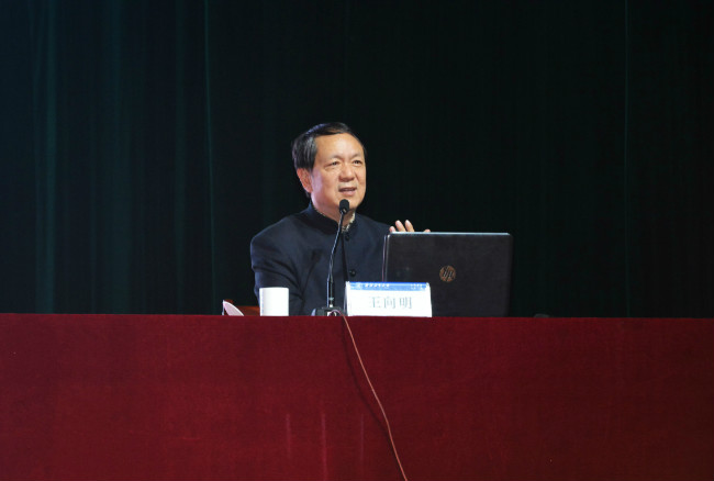 王向明教授以“要以科学的方法正确认识毛泽东”开篇,分析了近年来社会上在意识形态方面出现的一些错误倾向,告诫同学们要警惕历史虚无主义,强调作为新时代的大学生要有政治意识,并提出“你不关心政治,政治一定会关心你”的观点。他的授课幽默诙谐、引人入胜,在授课过程中旁征博引,充满了哲学思辨和逻辑思维。“为什么有的人对毛泽东主席无比尊敬,而有的人却要肆意诋毁?”针对该问题,王教授从方法论的角度作出了解答。通过分析冷战期间的美苏差异,他重点强调了方法和时机的重要性。他指出:“一个民族怎样评价自己的领袖,是衡量这个民族政治上是否成熟的重要标志”。为使同学们更加全面地了解和评价毛泽东,他推荐了《毛泽东诗词集》等系列书目,建议大家从诗词中感受毛泽东的风雨人生。随后,他激情澎湃的朗诵了毛泽东诗词,他的朗诵中,饱含着对伟人的尊崇与对历史的敬仰,令全场师生为之动容。王教授的报告在他深情演唱的《国际歌》歌声中结束。
