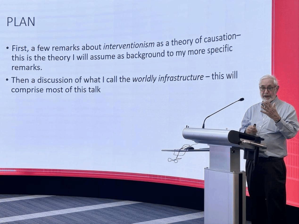 James Woodward教授以《因果的世界基础结构》为题,从干预主义因果理论出发,系统梳理了因果推理的哲学脉络。他指出,干预主义认为因果关系可通过操控与变化加以理解,即若对变量 C 的干预导致 E 的改变,则可认定 C 是 E 的原因。进一步地,他提出“世界基础结构”概念,强调科学中的因果推理之所以有效,依赖于现实世界中若干普遍存在的条件,如变量的统计独立性、可干预性、系统的模块化以及宏观规律对微观细节的相对独立。这些“友好于因果推理”的特征共同构成了支撑人类因果认知的现实基础。