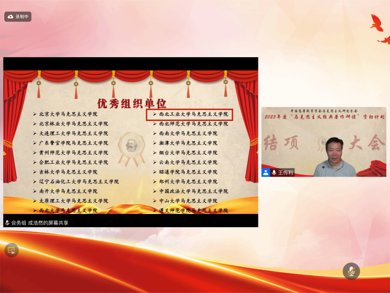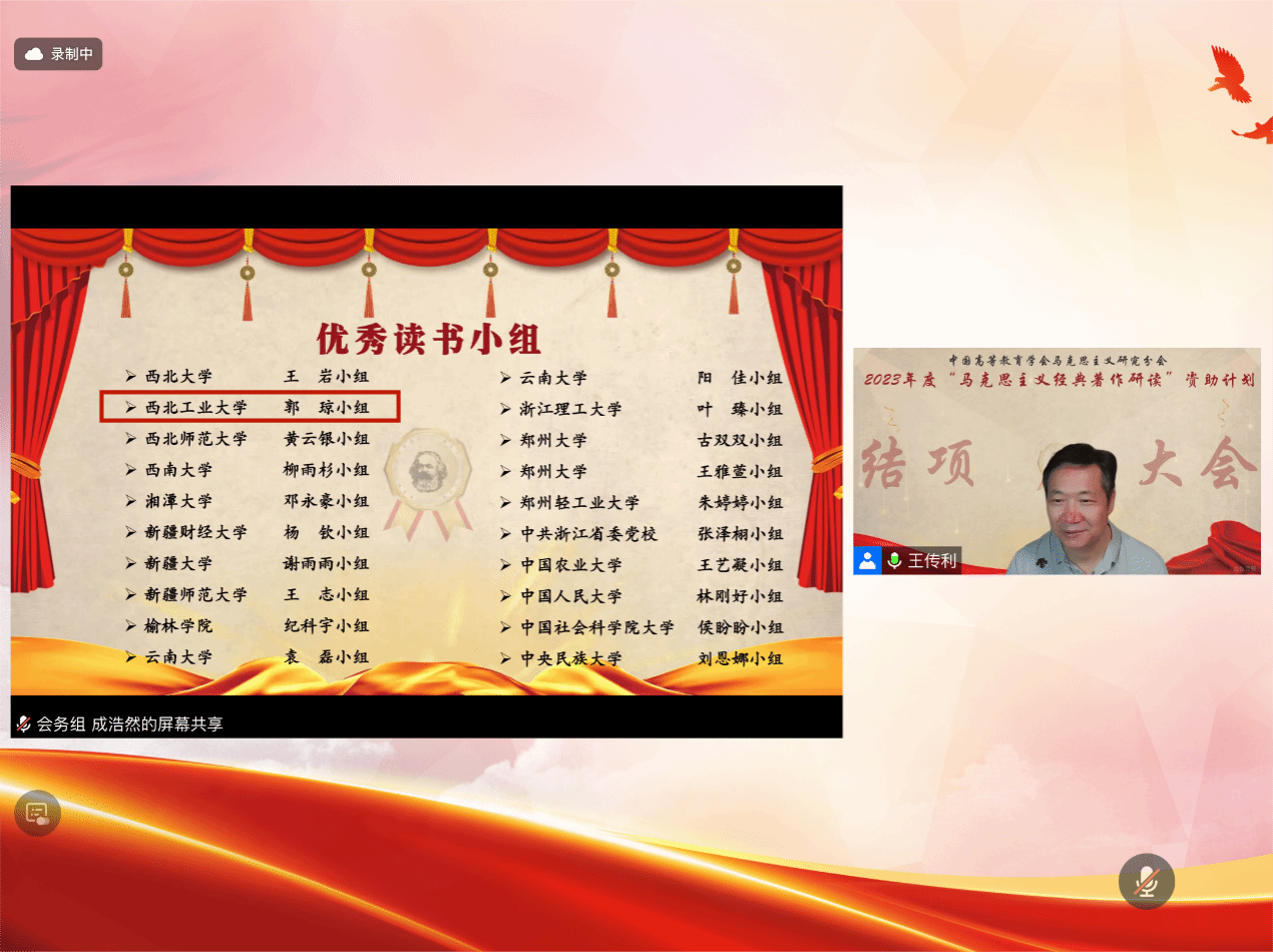 教授、马研会监事王传利教授宣读了优秀读书小组、优秀指导教师、优秀组织单位名单。与此同时,马研会秘书处、优秀小组组长代表、优秀指导教师代表、优秀组织单位代表及组委会督导员代表进行了经验交流与分享。最后,北京大学马克思主义党委副书记、马研会副理事长兼秘书长宋朝龙教授进行了总结发言。