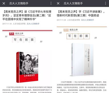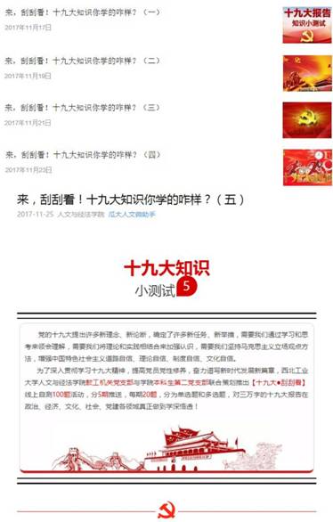 微信平台除常态化推送党的十九大精神学习材料、辅导报告等内容外,还专门开辟“周末党员之声”栏目,分享学生党员学原著的动态和悟原理的体会。近期,学生党员又自主开发了“学习答题刮刮看”栏目,分5期推出了党的十九大精神100题,为学生党员利用碎片化时间开展理论学习提供支撑。