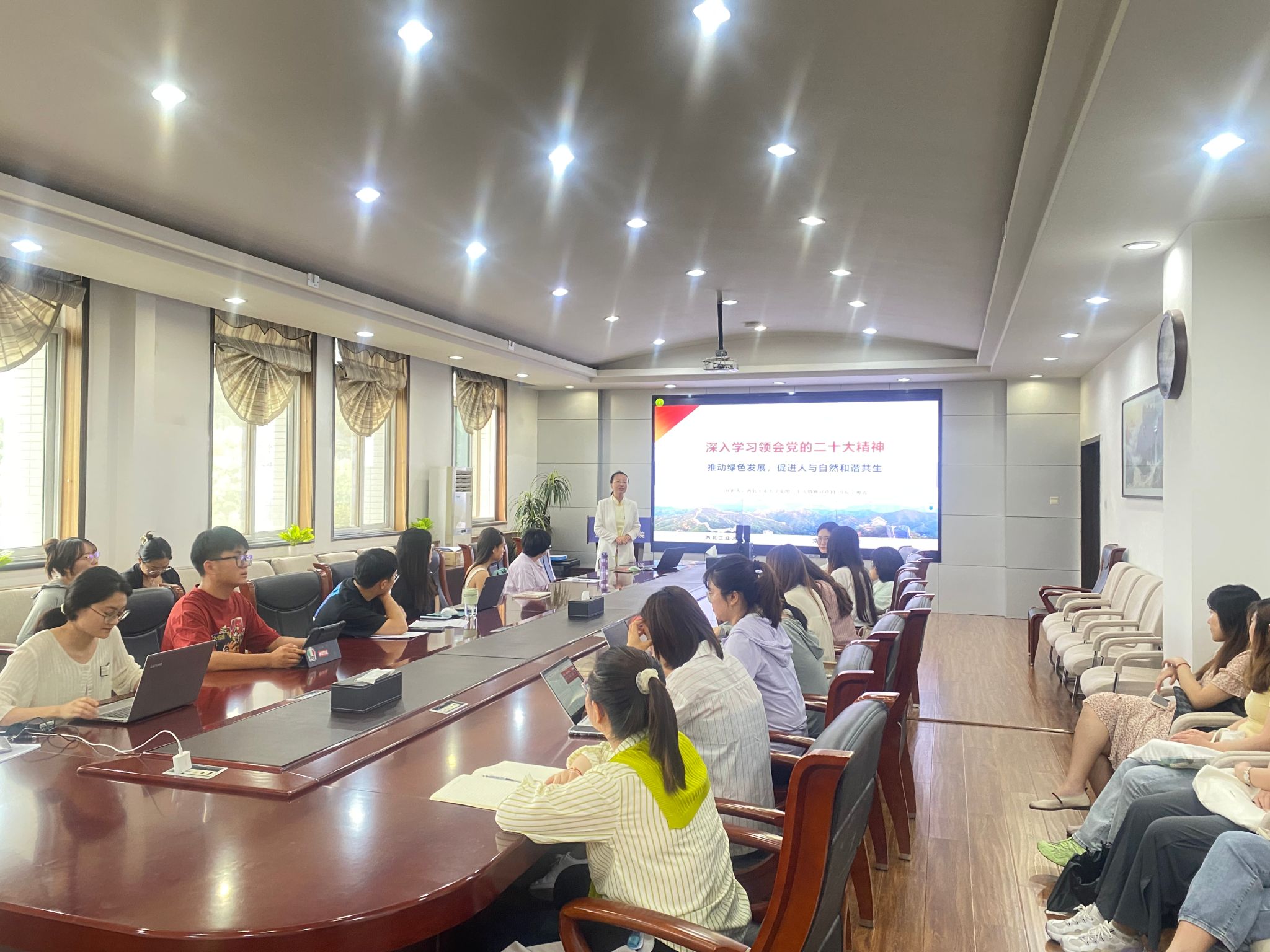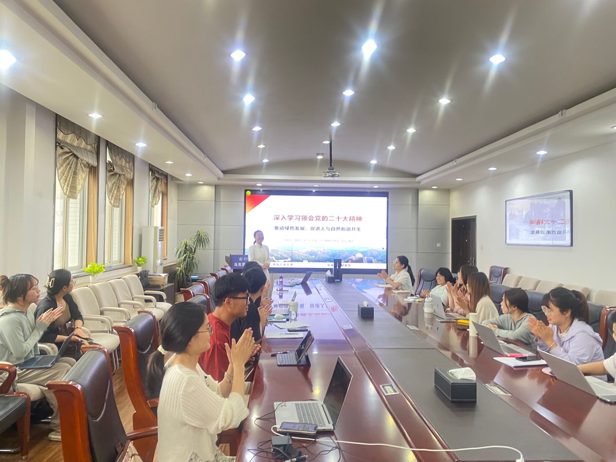 宁老师带领同学们学习回顾了党的二十大报告中关于习近平生态文明思想的精华部分,并观看视频短片“推动绿色发展 促进人与自然和谐共生——金句来习”深入体会习近平总书记的生态理念,阐述推动绿色发展、生态文明的原因,从决议原文分析习近平经济思想与习近平生态文明思想的交融,从学术角度分析习近平总书记如何提出的“经济发展新常态”,为同学们开拓思路,大家都表示收获匪浅。