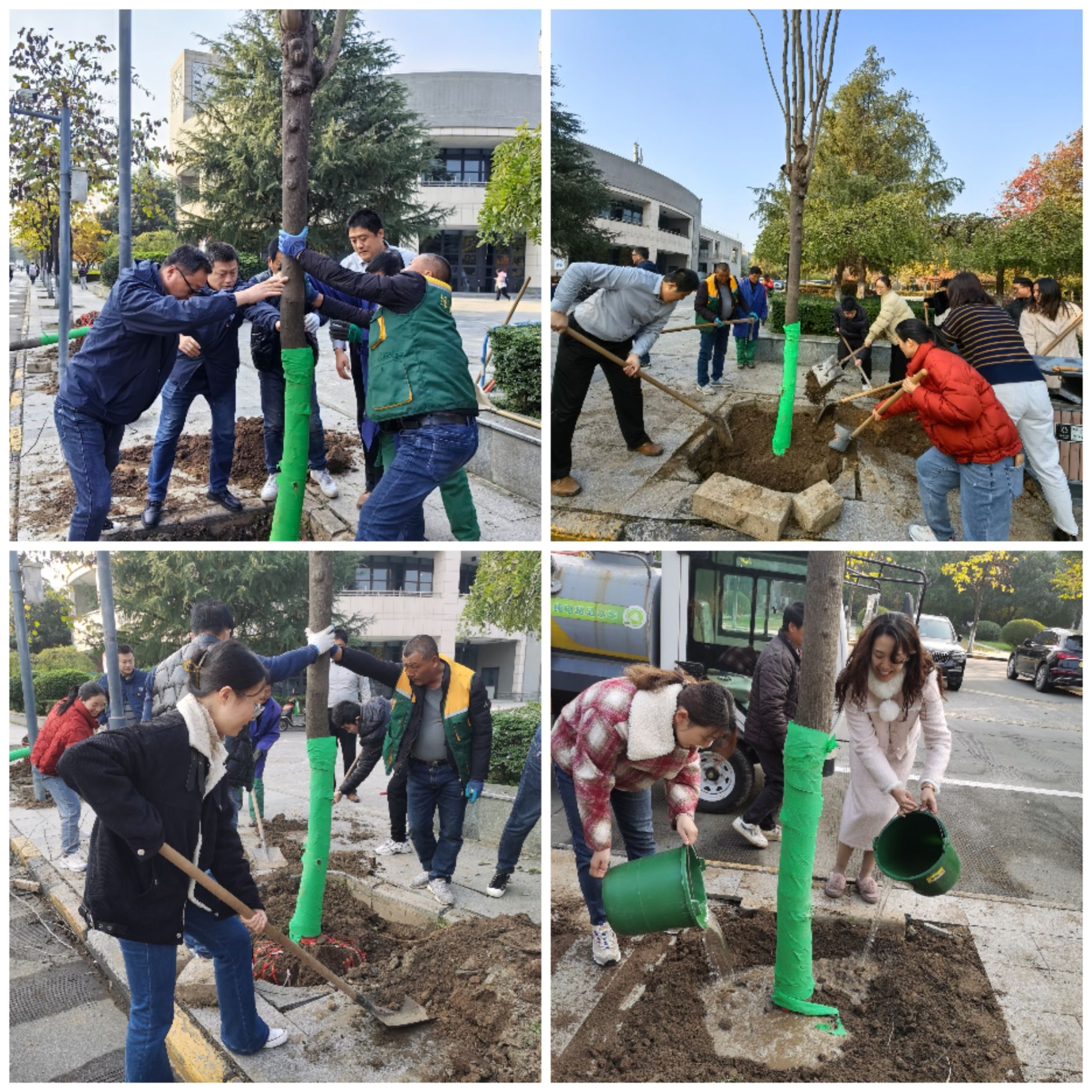 在后勤产业集团物业服务中心专业人员指导下,党员同志们热情高涨,分工协作,挥锹铲土、扶苗填坑、耐心浇灌、种植新绿,不到半小时,两棵高大的紫荆树便被种好在了银河路边。大家看着自己的劳动成果激动而自豪,纷纷合影留念。