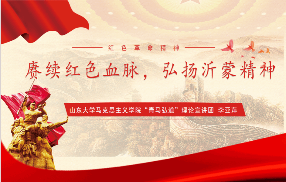 “青马弘道”理论宣讲团成员李亚萍以《赓续红色血脉,弘扬沂蒙精神》为题进行宣讲。李亚萍同学围绕沂蒙精神的基本内涵、生成逻辑、践行路径三个层次展开阐释,强调只有尊重人民群众的历史首创精神,依靠人民群众这一真正的铜墙铁壁,才能赢得革命和建设事业的胜利和成功。