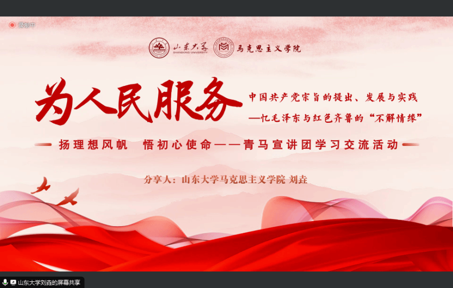 “青马弘道”理论宣讲团成员刘垚围绕为“人民服务”核心关键词,将毛泽东同志与齐鲁的不解情缘融入“为人民服务”思想的发展演变过程,生动阐述了中国共产党为人民服务宗旨的提出、发展与实践。刘垚同学谈到,作为青年马克思主义者应始终坚持全心全意为人民服务的根本宗旨,努力将专业知识与实践调研相结合,将创新思想与经验借鉴相统一,将学生身份与社会关切相辉映,努力做走在时代前列的奋进者、开拓者、奉献者。