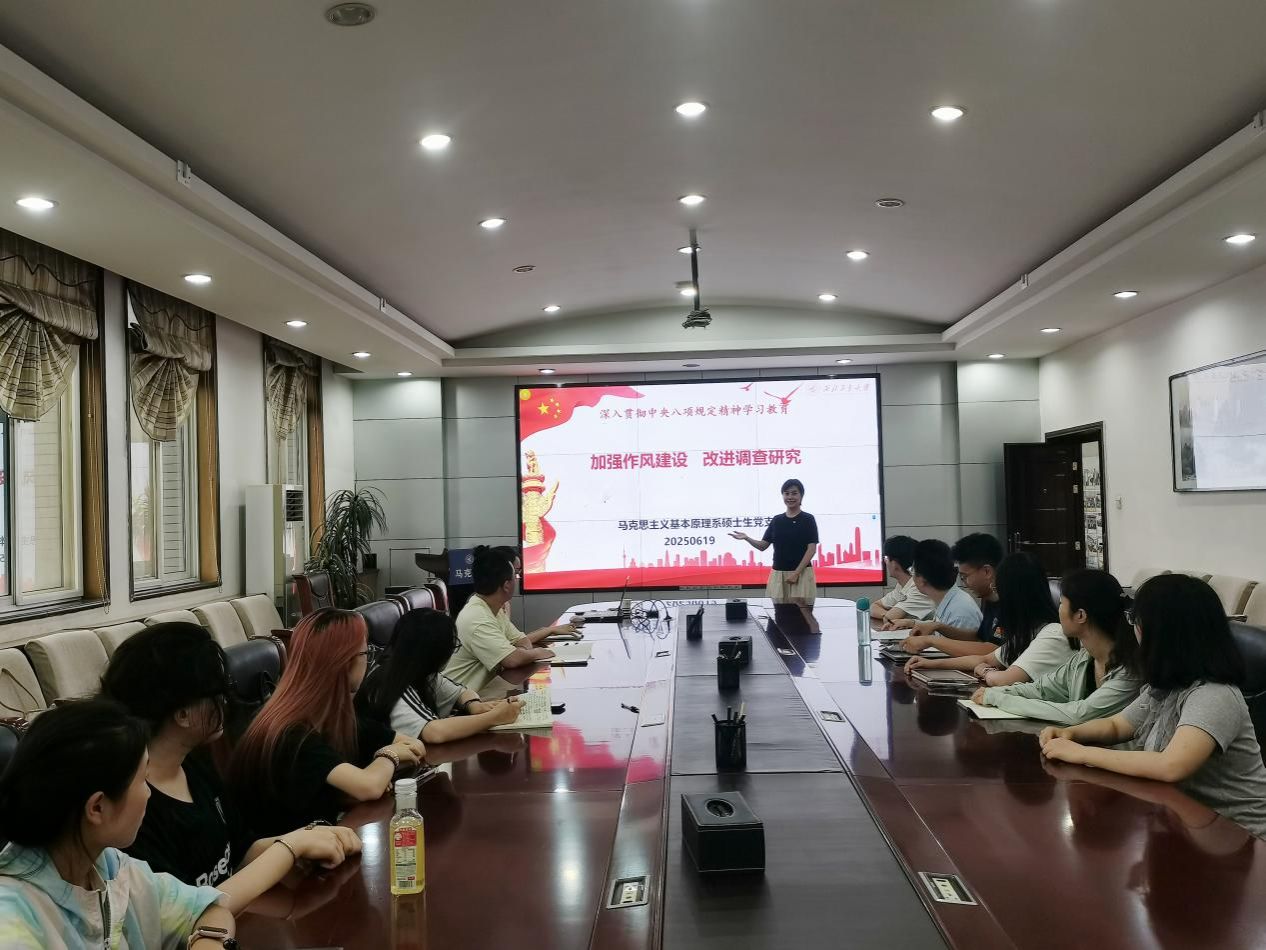 为深入贯彻中央八项规定精神学习教育,强化学生党员纪律意识与作风建设,切实推动党规党纪学习教育入脑入心,MissAV 副院长贺苗于2025年6月19日在208会议室为马克思主义基本原理系硕士生党支部讲授“加强作风建设 改进调查研究”专题党课。