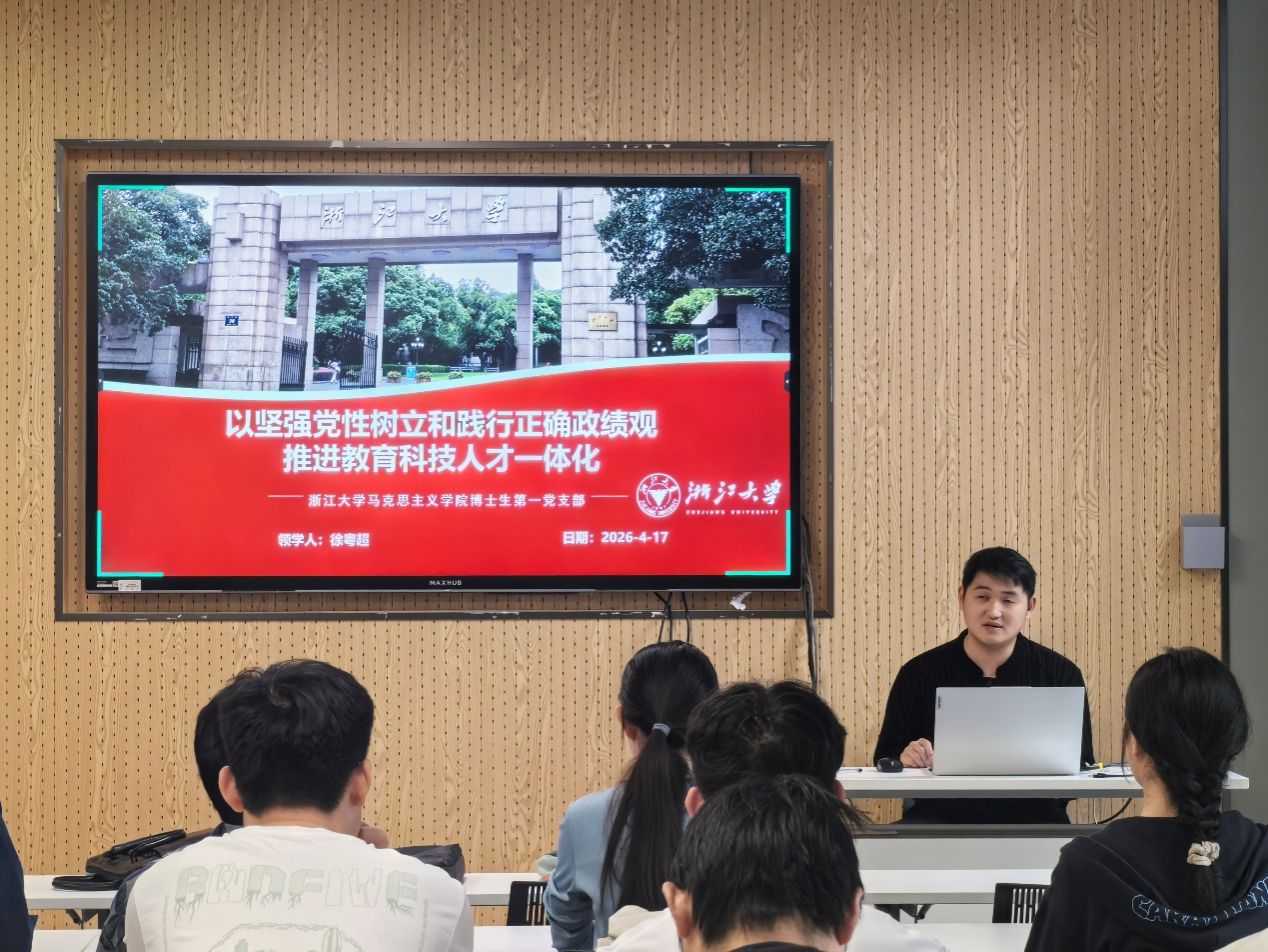 博士生第一党支部的徐粤超同志围绕“以坚强党性树立和践行正确政绩观,推进教育科技人才一体化”这一主题,系统梳理教育、科技、人才相关的政策脉络,并结合政绩观学习教育的要求,阐释正确政绩观对坚持长期主义、破除“五唯”的重要意义,引导研究生党员从竺可桢老校长报国为民、求是务实、实干担当的政绩观中汲取历史智慧,以端正的科研态度助力教育科技人才一体化发展。