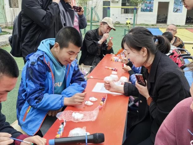 此次活动还准备了涂色石膏娃娃、折纸游戏等,志愿者们陪“心青年”用彩笔给石膏娃娃上颜色,在“心青年”的眼里,每个图形每个图案都有属于自己理解的颜色;操场另一端,志愿者手把手耐心教孩子们叠纸,共同放飞纸飞机,陪伴孩子们一同做球类游戏,以行动点燃点点微光,照亮心智障碍者们孤独的内心世界。