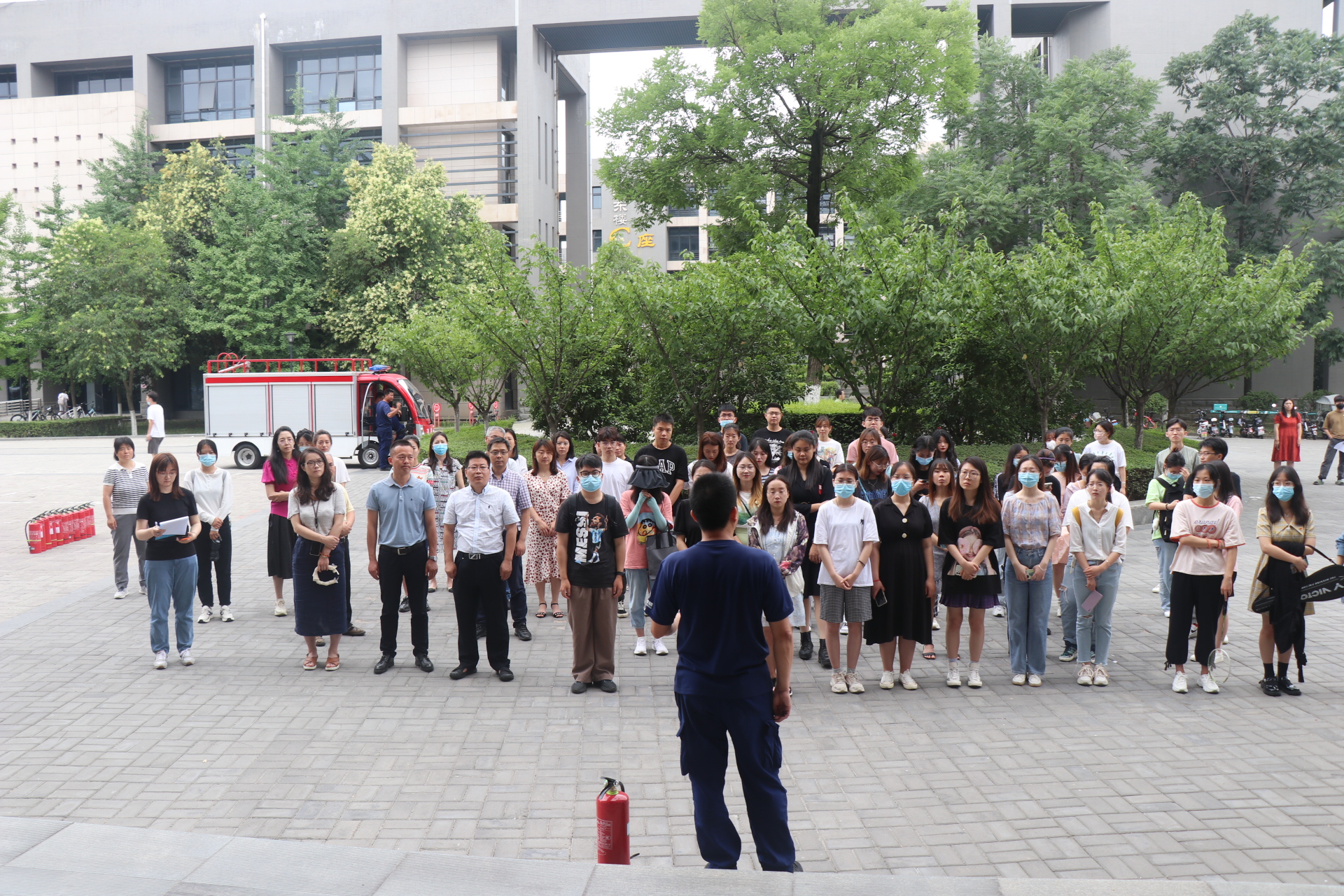 院楼前的空旷场地开展消防演练活动,师生们踊跃参加到消防演练中,纷纷运用刚学到的灭火方法,在模拟练习中逐渐深化消防意识和自我保护意识。