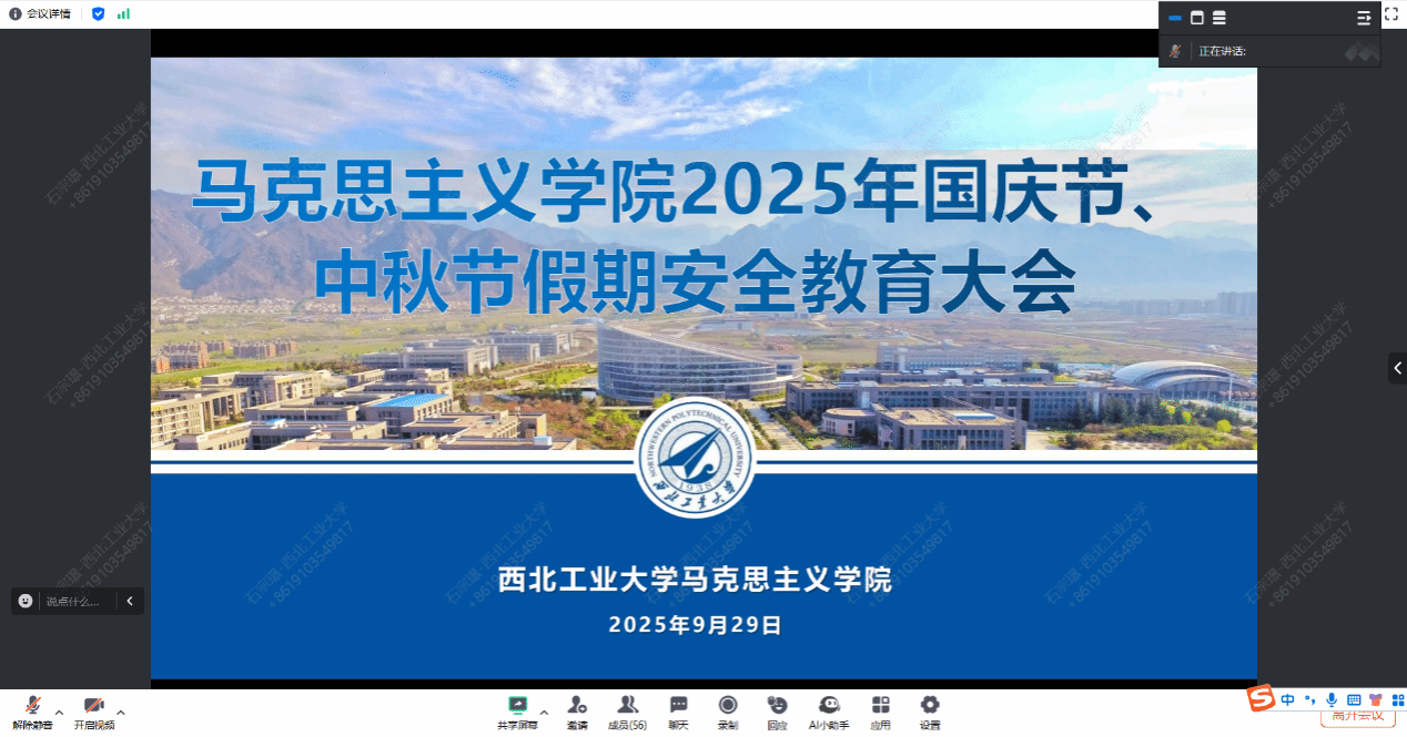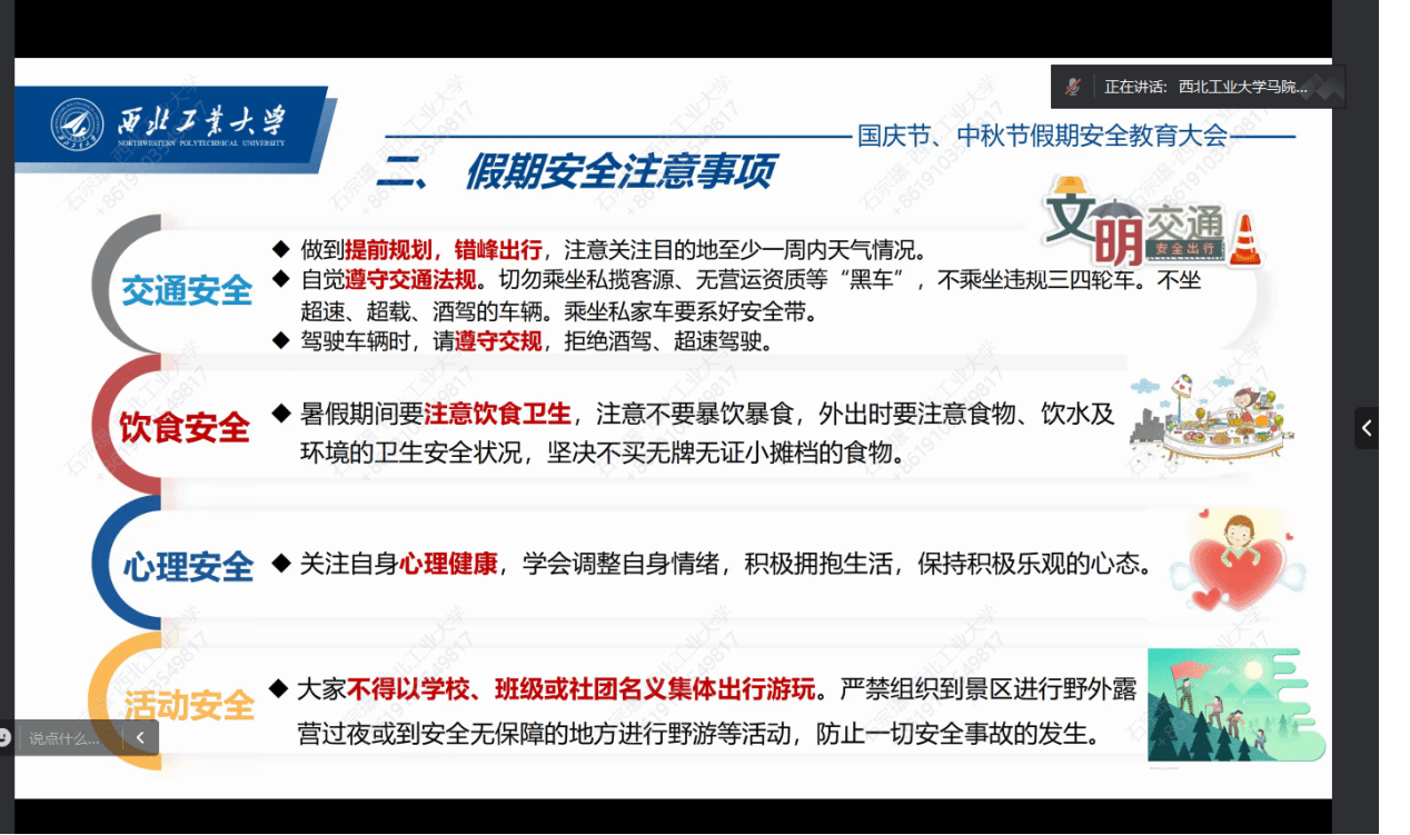 双节假期离校与留校规定进行了再布置再要求,强调双节期间无论在校内外,均需严格遵守校规校纪,将安全意识入脑入心,保障人身与财产安全。随后,她围绕宿舍、交通、居家、财产等领域安全注意事项,要求同学们从思想上筑牢安全防线,从行动上落实安全措施,并特别提醒遵守校园交通规定,文明行驶以维护校园安全。硕士生辅导员王换、博士辅导员