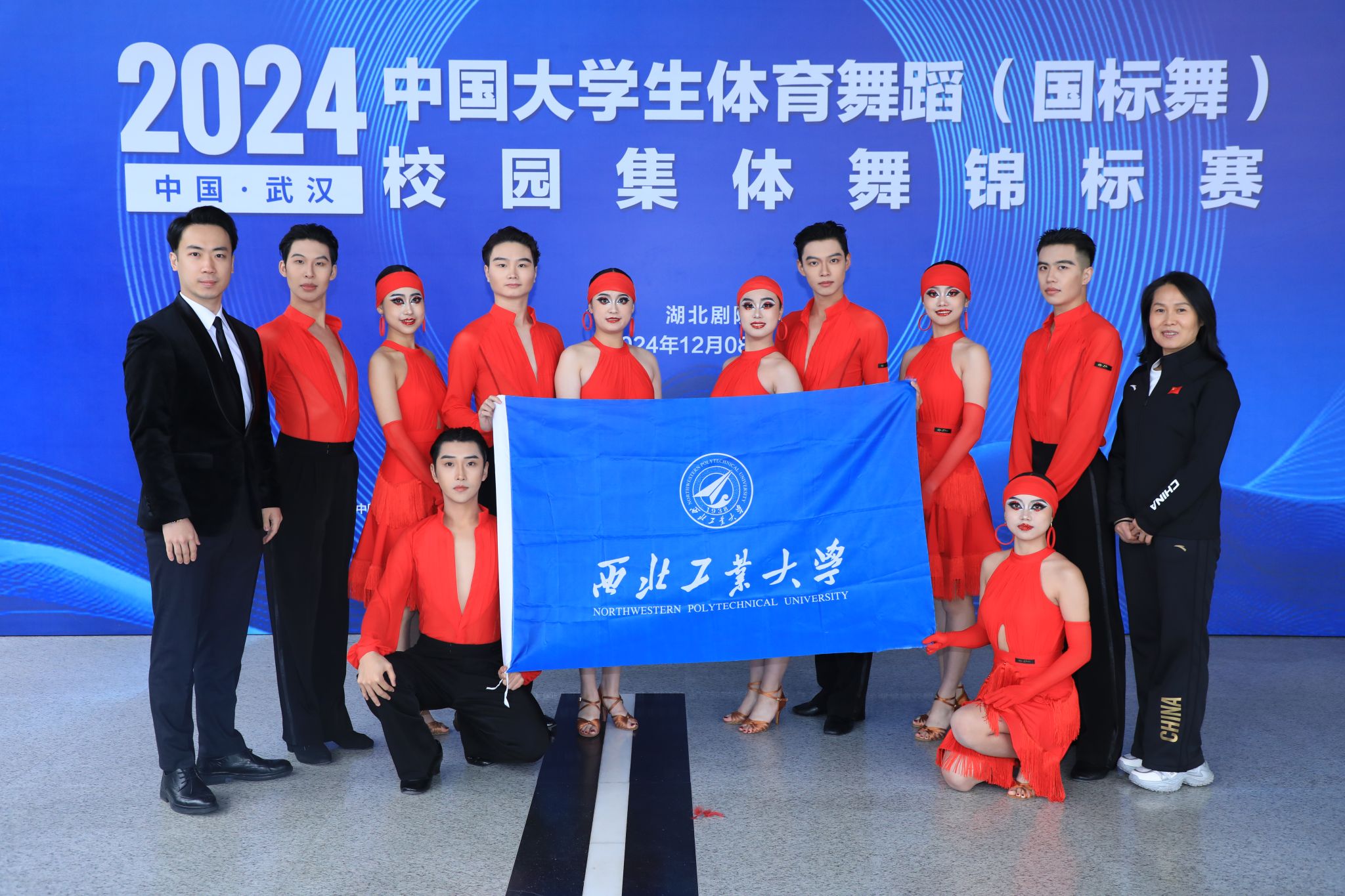 在大学甲组中级双人校园舞恰恰组的比赛中,谢琳同学和9位队员们不仅展现出队伍炉火纯青的技术,更体现出西工大学子们积极向上的精神面貌。最终,西工大体育舞蹈队以89.1分的高分获得了全国第一名的佳绩。