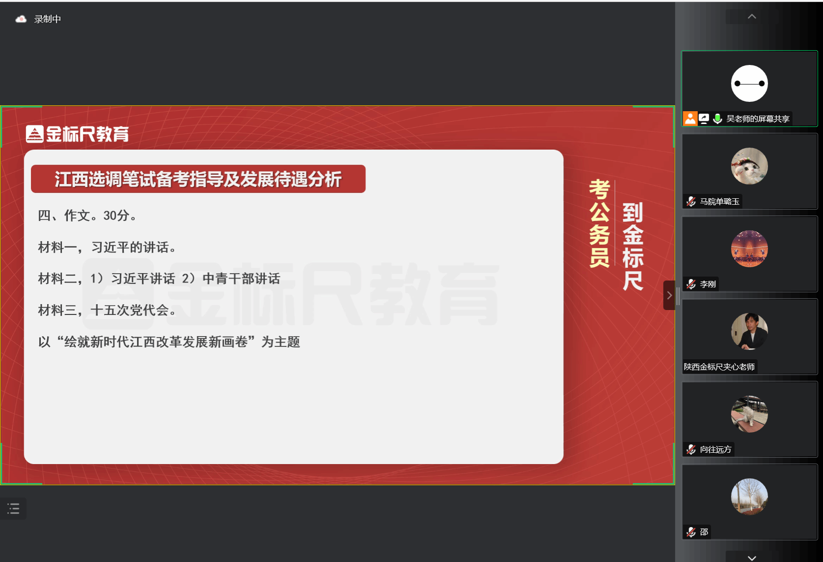 联合金标尺教育特推出“江西选调公告解读及备考指导”就业指导系列讲座。本次讲座邀请嘉宾为来自金标尺教育的吴沈川老师,由兼职辅导员单璐玉主持。