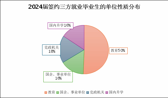 毕业生共计46人,整体就业率96%。其中,博士毕业生12人,就业率100%;硕士毕业生34人,就业率94%。总体而言,就业岗位与学科方向契合度强、硕士生升学率占比突出。从单位所属行业来看,毕业生就业人数较多的行业主要是教育行业,共计22人签约思政课教师、辅导员,占比50%。同时,硕博毕业生中有8人进入党政机关,其中4人选择选调生队伍,赴陕西、山西省份扎根基层、挺膺青春担当。针对2024届毕业生签约单位开展问卷调研,收到来自高等MissAV
