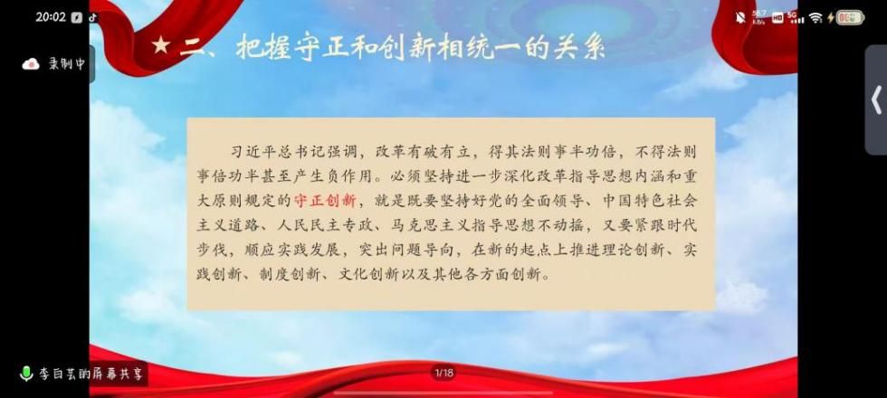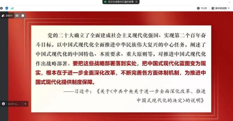 导读环节结束后,韩华教授对两位同学的导读给予高度评价。他充分肯定了两位同学的充分准备和深入理解,并强调了进一步全面深化改革、推进中国式现代化的理论和实践的重要性。韩教授进一步强调,全面深化改革是推动中国式现代化的关键举措,必须始终坚持党的全面领导、以人民为中心、守正创新、系统观念、全面依法治国等原则。同时,也要深刻理解和把握党的二十届三中全会《中共中央关于进一步全面深化改革、推进中国式现代化的决定》中的战略安排、基本原则和重点要求,为推动高质量发展、构建人类命运共同体贡献力量。