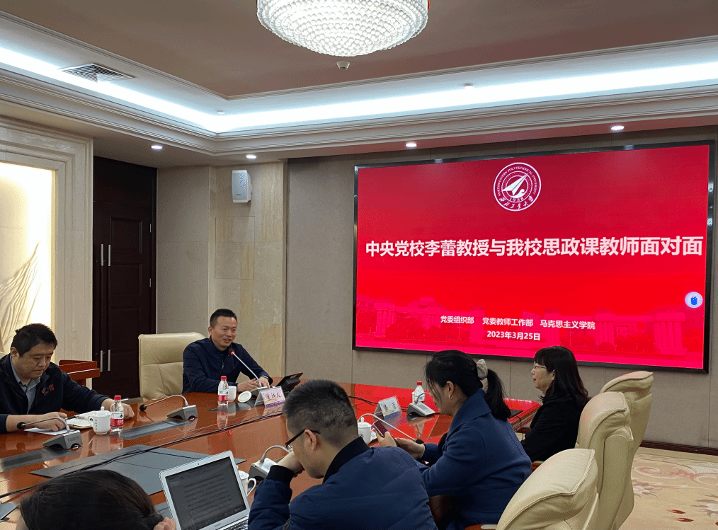 的热情欢迎表示由衷感谢。随后,李蕾教授介绍了中央党校的机构设置及涵盖的授课范围,以及所采取的集体备课运行机制,从自身所讲授的习近平经济思想专题引入,讲述如何提高思政课的思想性、理论性、亲和力和针对性。接着,她从自身角度出发分享了当面对具有完备知识框架与较高综合素养的授课对象时,如何在高度还原理论的基础上最大限度的满足学员的期待值。她强调,判断一堂课的高效程度,在于是否带给了学生头脑中的增量。坚持以问题为导向,了解学生切身所需,力求展现给学生内容的多方位、新视角。