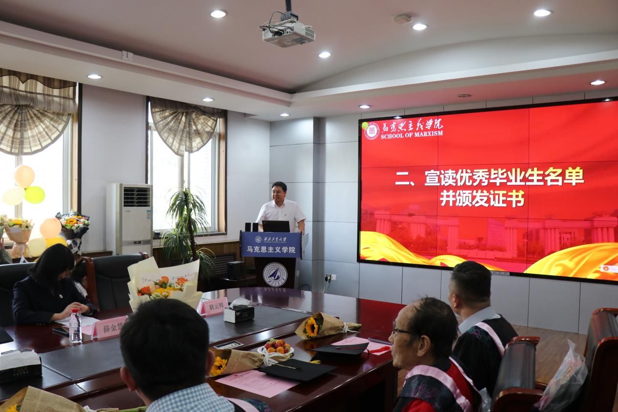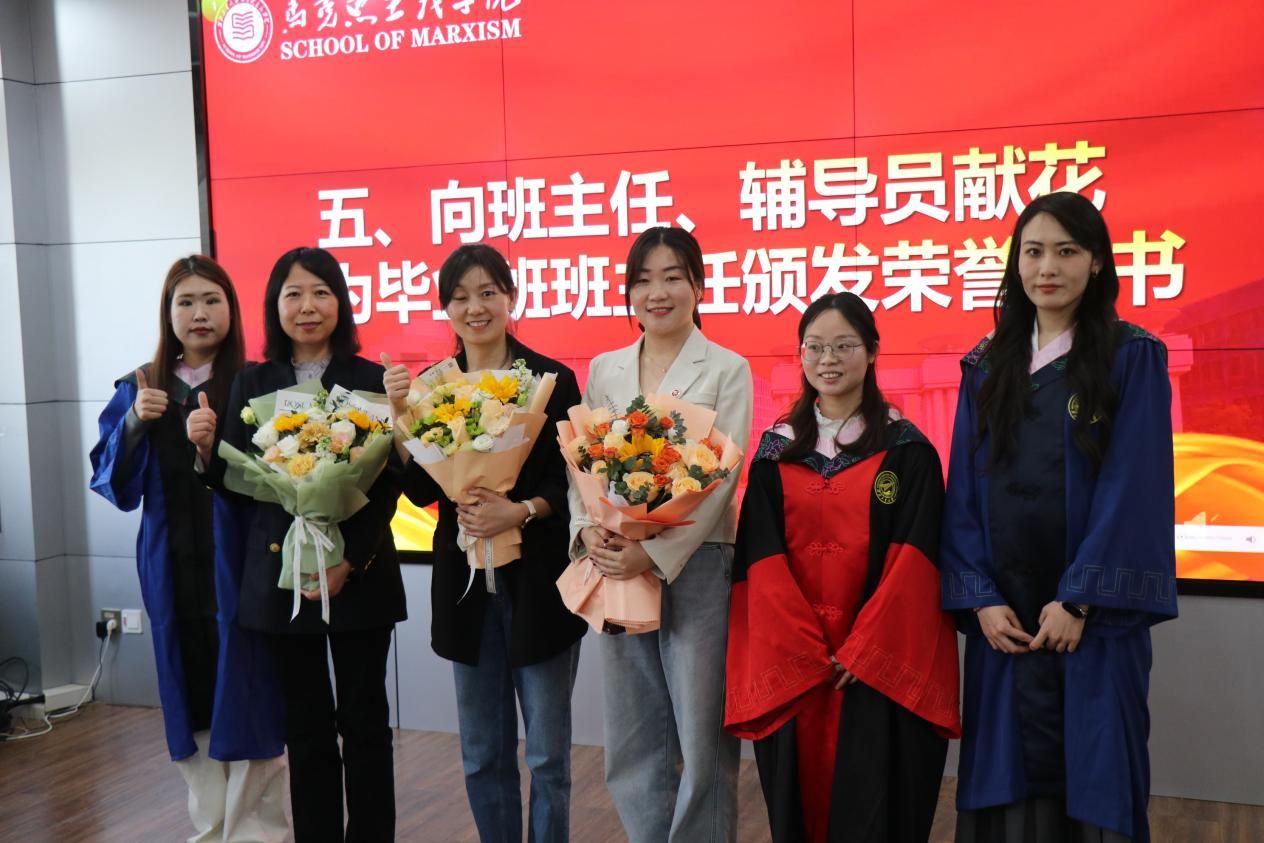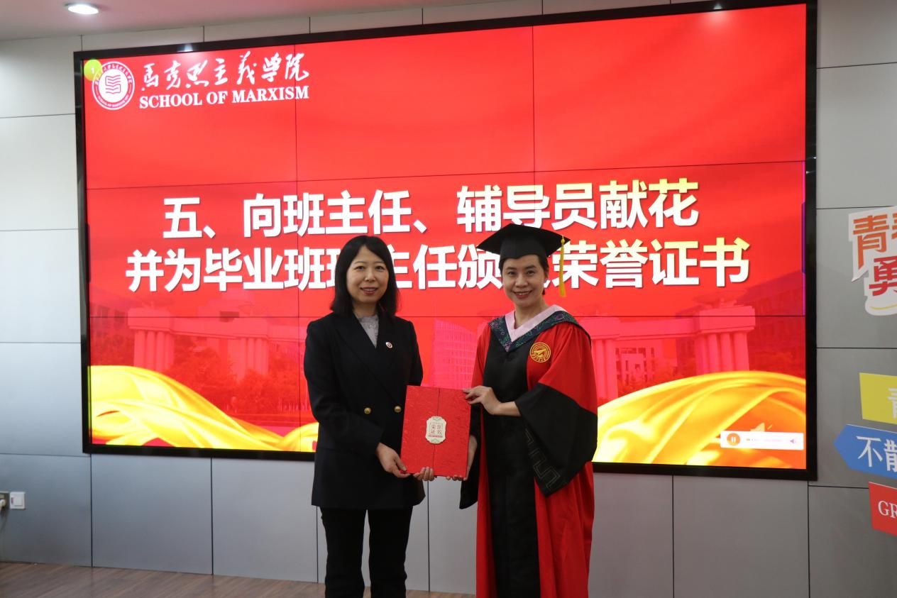 毕业生代表为硕士生辅导员王换、博士生辅导员许斯诺、毕业生班主任代表薛金慧献花,MissAV 副院长贺苗为薛金慧颁发荣誉证书,以感谢老师们近年来的辛勤付出和无私奉献。随后,薛金慧发表了感人至深的发言,向顺利完成学业的同学们表示祝贺,并以“热情、责任、勇敢”寄语毕业生们在新的人生道路上充满激情、肩负使命、无畏前行。