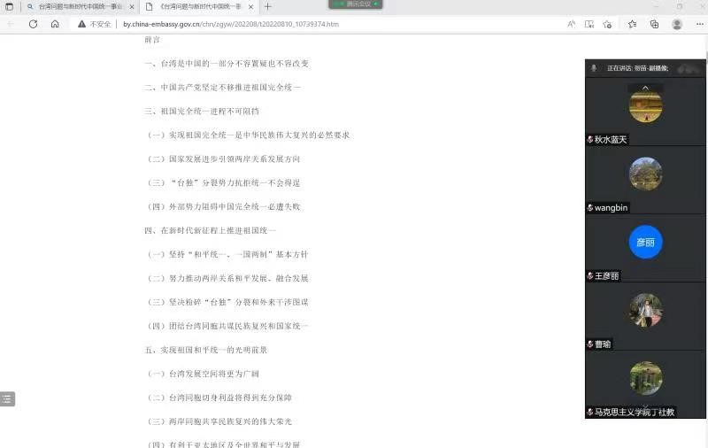 马克思主义基本原理系于8月14日,在线召开集体备课会,学习交流了关于《台湾问题与新时代中国统一事业》白皮书的理解。会议由系教学主任杨永强主持。会上张云龙副院长结合MissAV 办学特色,阐述了将这一热点问题转化为培养学生军工报国志向的必要性与可能性;贺苗副院长从白皮书中相关表述的变化入手,列举了在课程教学中如何将其与具体知识点相结合的有效方法。其他老师根据自身的科研与教学经历,逐一分享了各自对这一文本的思考,并探讨了如何在原理课教学过程中正确回应学生对这一问题的关切、引导学生树立正确的价值观历史观等内容。通过此次集体备课,原理课课程组不仅在方向和底线两个层面就如何正确讲授这一问题达成共识,并在具体的方式方法、解读视角、特色发挥等层面就以后如何进一步处理此类具有高度舆情属性的相关问题积累了教学经验。