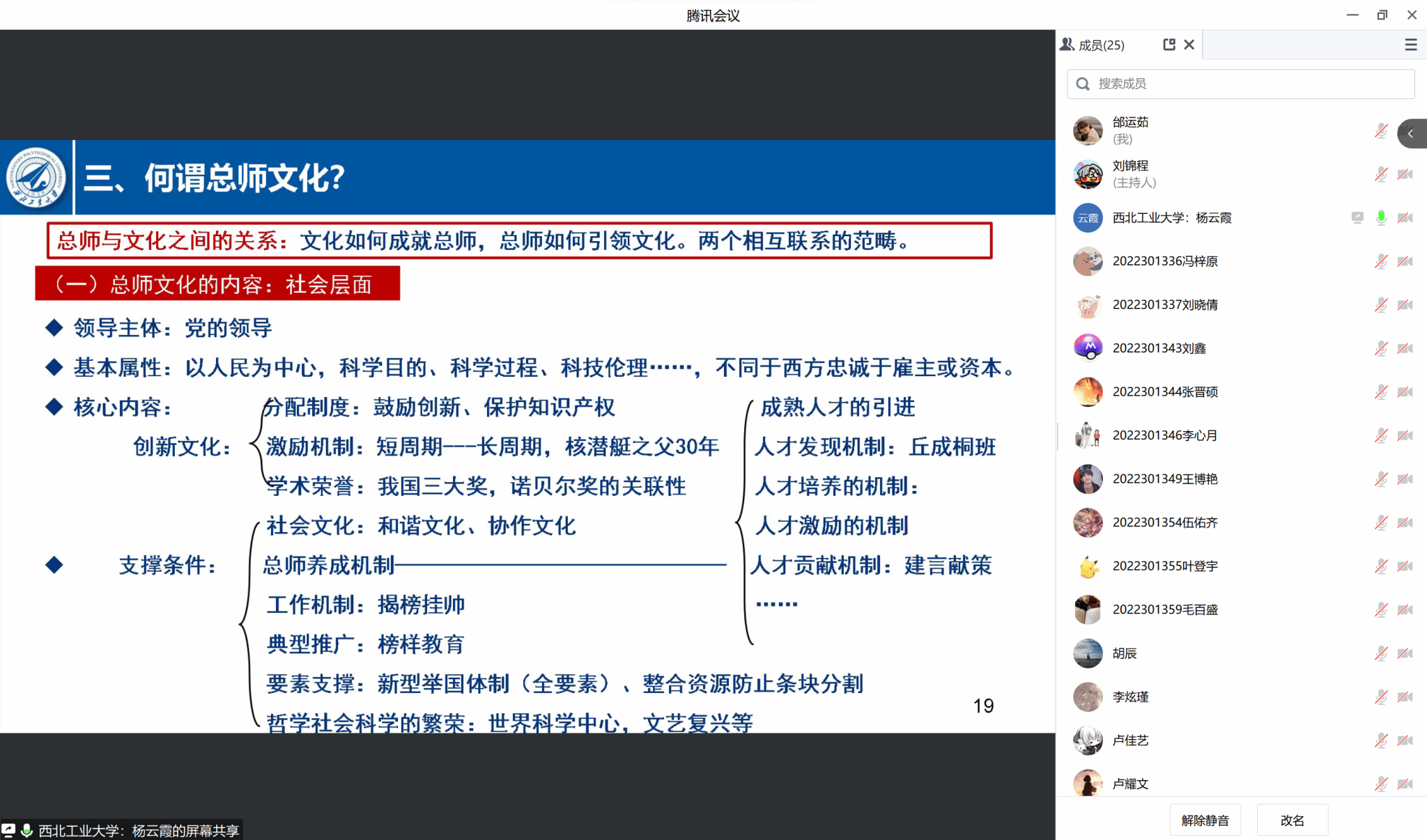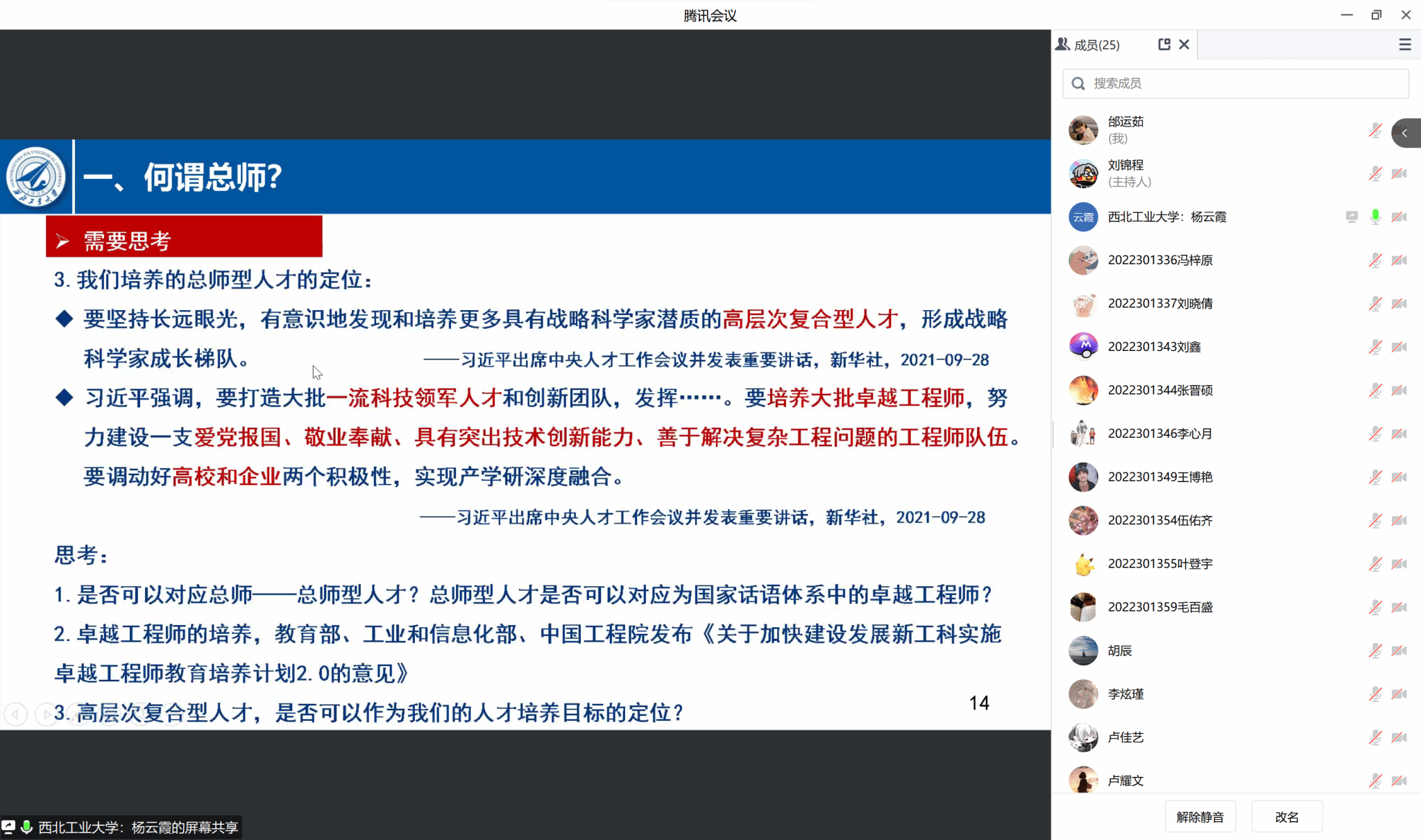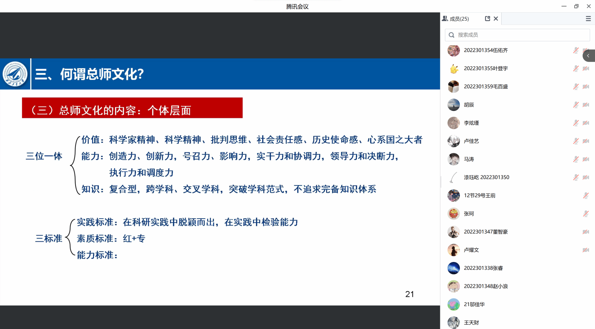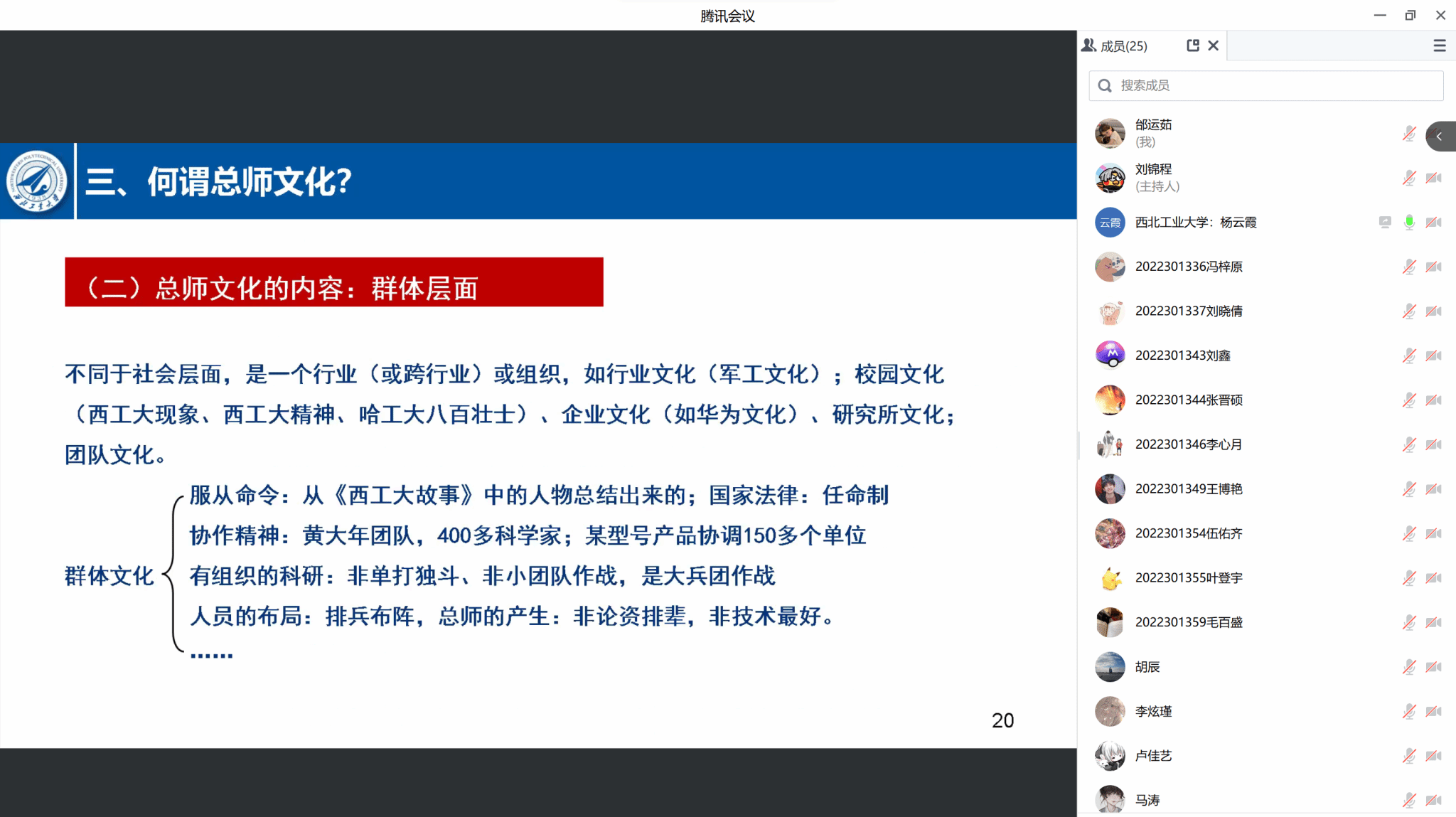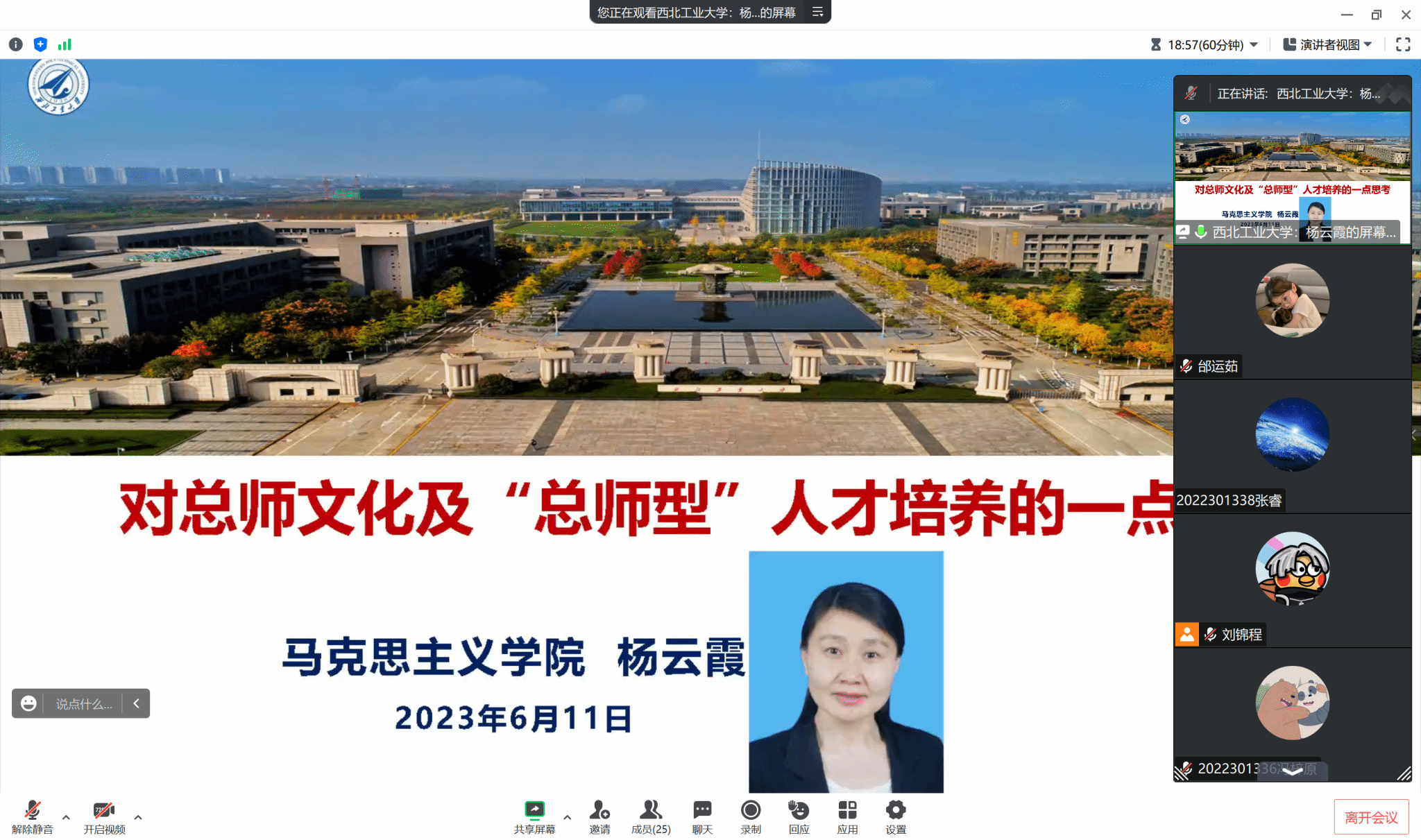 院长杨云霞为其联系的DL032207班在线讲授了主题为“对总师文化及‘总师型’人才培养的一点思考”的思政课,班级25名同学全体参与并展开了研讨。