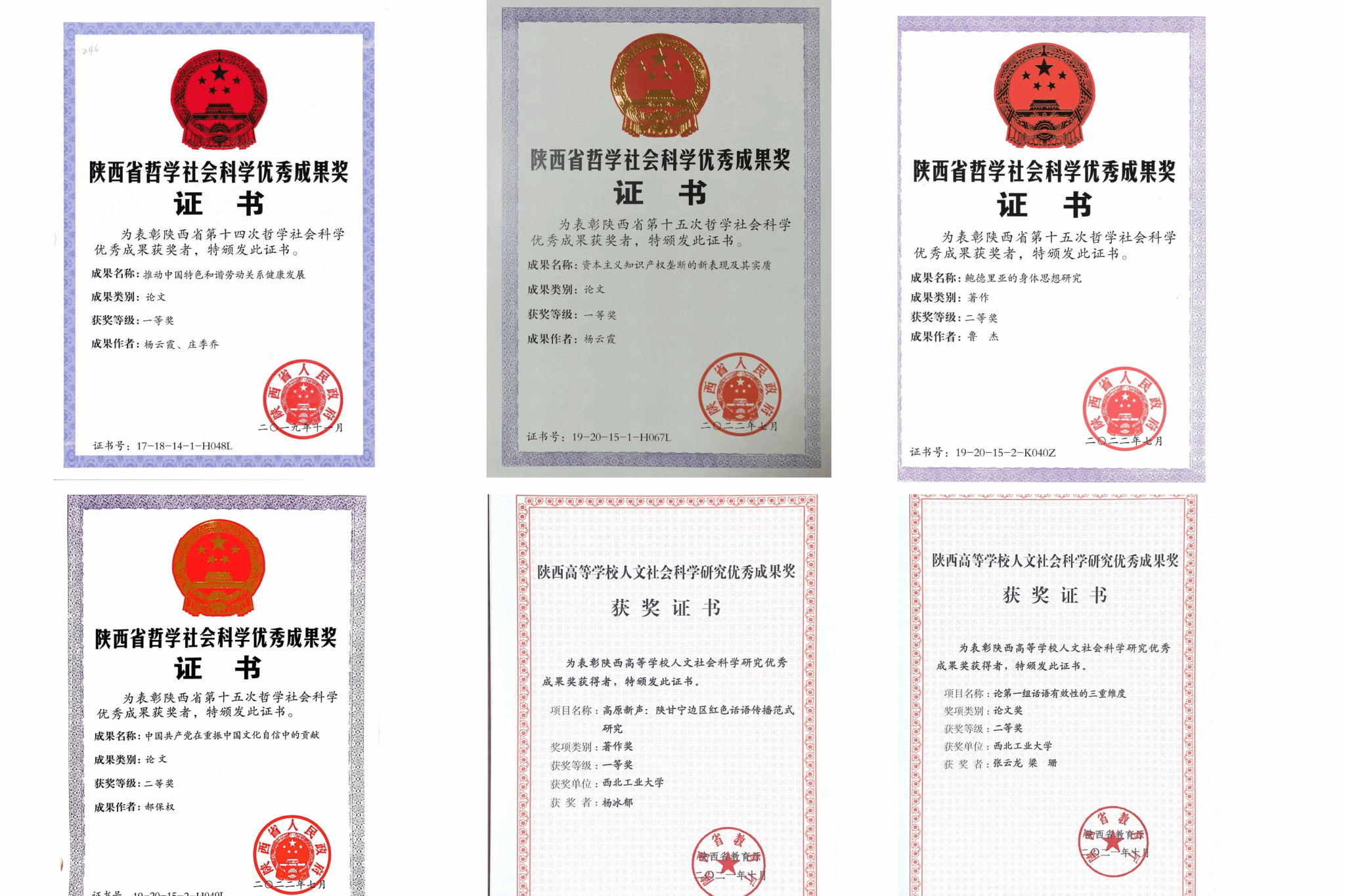 Over the past five years, the School of Marxism has been awarded 38 National Social Science Funds (including one major project), 16 Humanities and Social Science Projects of the Ministry of Education (including one major project), 40 Social Science Funds of Shaanxi Province (including two major projects), and more than 70 provincial and ministerial-level projects (one provincial research team). It has published more than 470 academic papers, including more than 180 CSSCI papers, more than 20 papers in the central "three newspapers and one journal", and 32 high-level academic monographs. It has won 18 Outstanding Achievement Awards in Philosophy and Social Sciences of Shaanxi Province, 14 Outstanding Achievement Awards in Humanities and Social Sciences of Universities in Shaanxi Province, 1 Outstanding Thesis Award in Natural Sciences of Shaanxi Province, and 90 decision-making and consulting reports have been positively approved by the leaders of provinces and ministries, and adopted by the departments of provinces and ministries, etc. The main representative achievements are as follows.